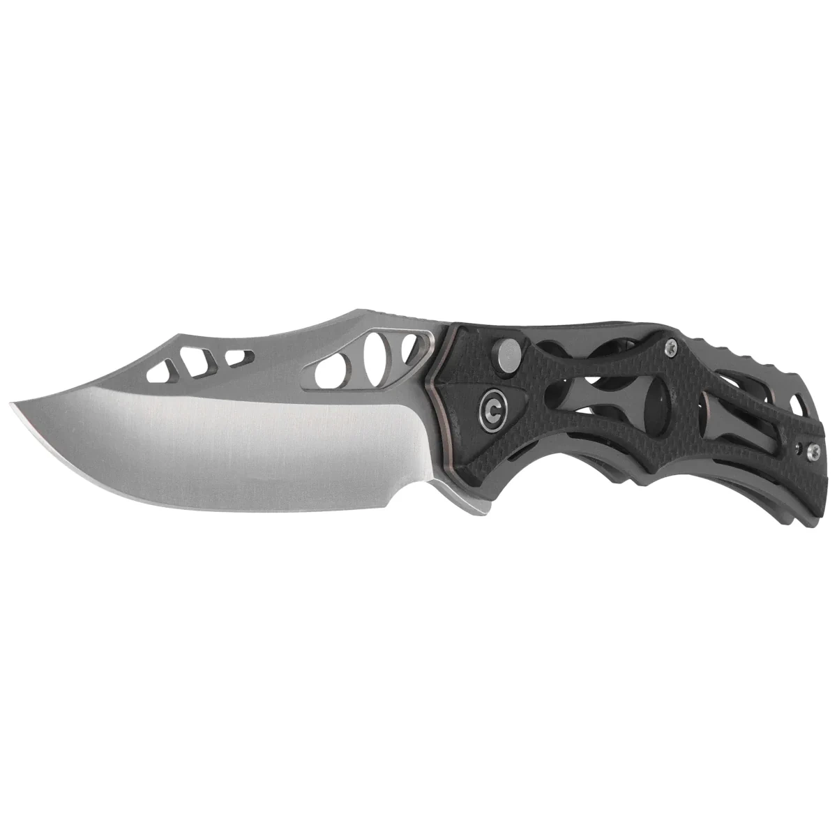 Handle - skeletonized, made of aluminum, to which heavily cut G10 composite grips were screwed . This gives the fingers plenty of support points for a secure grip. A fore finger groove made at the front improves ergonomics. The open-backed design, fixed with steel spacer sleeves, reduces weight and facilitates cleaning. The simple, secure design gives assurance of many years of use. Thanks to all these design measures, the full-size folder reaches a staggering 75g in weight. The pivot axis is adorned with a stylized Civivi brand logo . The two-position (right/left), deep-carry clip allows you to carry the knife discreetly in your pocket in tip-up position (blade tip up).