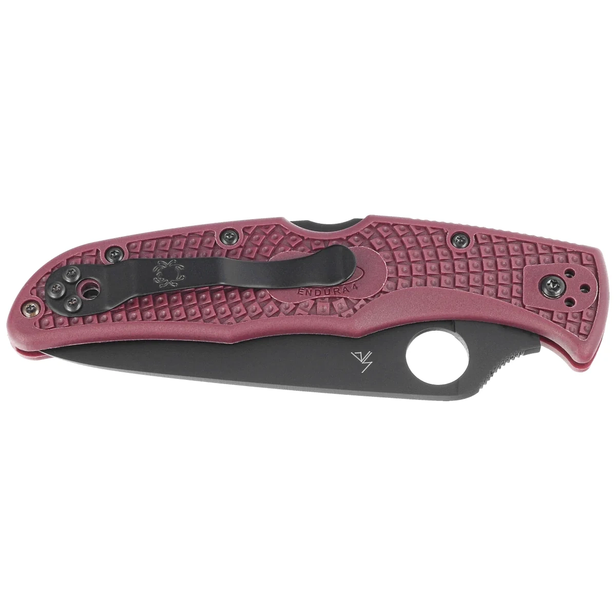 Endura 4 Sprint Run™ Burgundy FRN, TiCN Micro-Melt PD#1, a limited edition of one of Spyderco's most famous EDC folding knives, the Endura model. State-of-the-art Carpenter® Technology's Micro-Melt PD#1 steel . Superb E.D.C. with injection-molded grips in an elite burgundy color. Reinforced fully demountable skeletonized construction joined by torx screws, for easy cleaning, folder adjustment. Attached in four planes clip (4-way clip positions). Thanks to improved ergonomics and design, the knife gained in rigidity, functionality, aesthetics. In 1990, Spyderco introduced two models of knives: the Endura and Delica, creating a demand for lightweight one-handed opening folders at an affordable price. These products have become bestsellers. Thanks to their small size and low weight, they are an excellent choice as everyday EDC knives .
