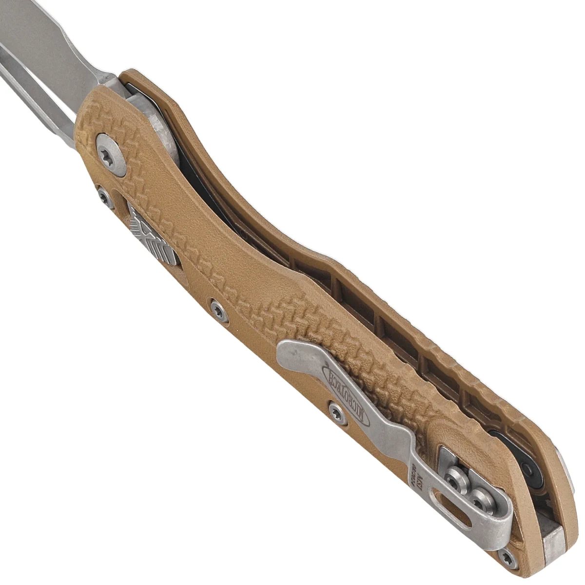 Handle - made of durable polymer, covered with Tri-Grip texture for better grip . Wide locking slide with Microtech's characteristic stepped X structure. Both grips are bolted together with a solid aluminum backspacer. The double-sided (right / left) clip allows you to discreetly carry the knife in tip-up position. Above the clip a lanyard hole, a place for a safety or decorative cord.