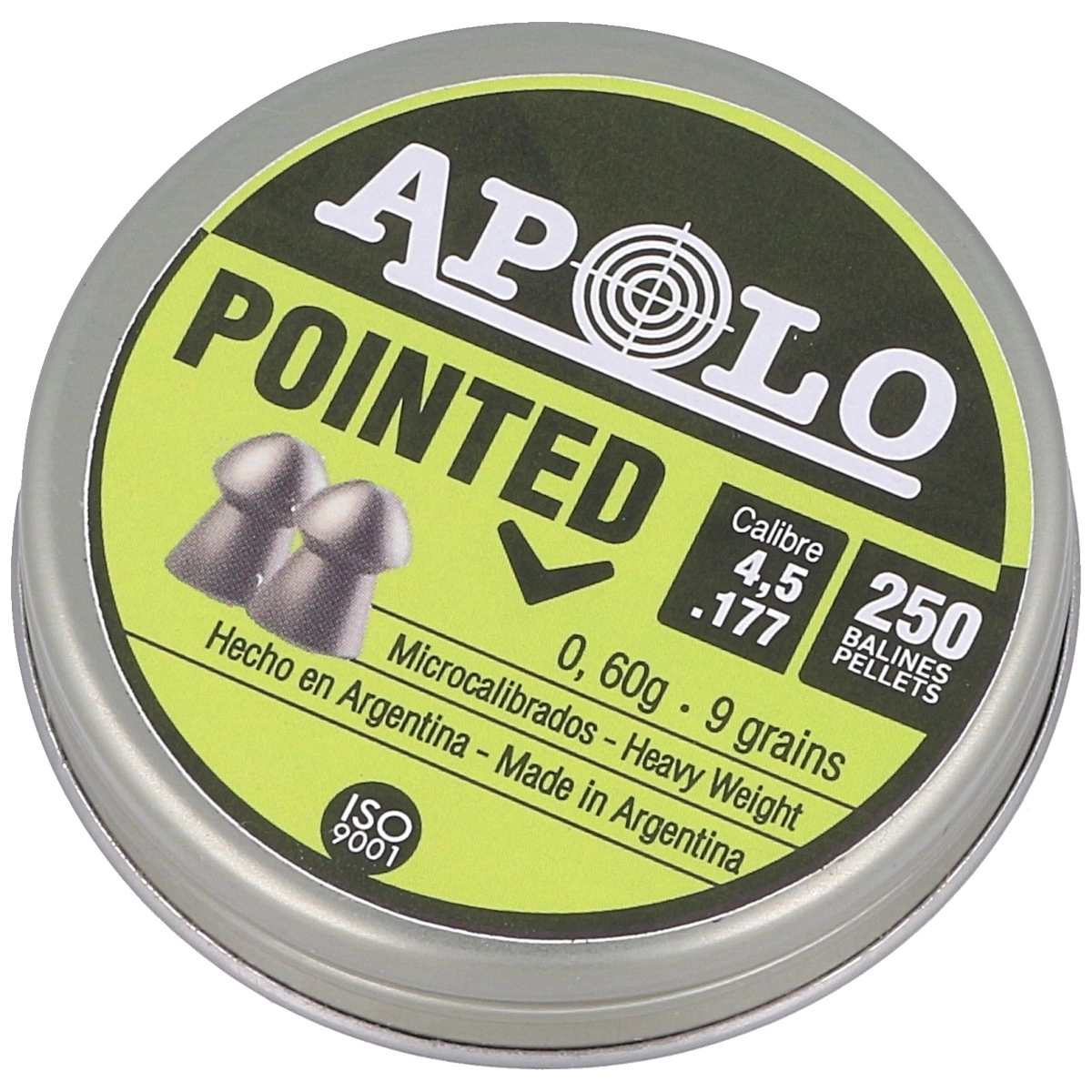 Pointed .177 precision and heavy over-caliber pellets in 4.51 mm (provides a better barrel seal, spins more effectively in the rifling, achieving greater range) with a Ballistic Coefficient BC: 0.027. Premium-grade ammunition for FT shooting and long distances by the Argentine company Apolo. Made from a low-lead alloy, this premium ammunition leaves minimal residue in the barrel. Packaged in a screw-top metal tin, 250 rounds.