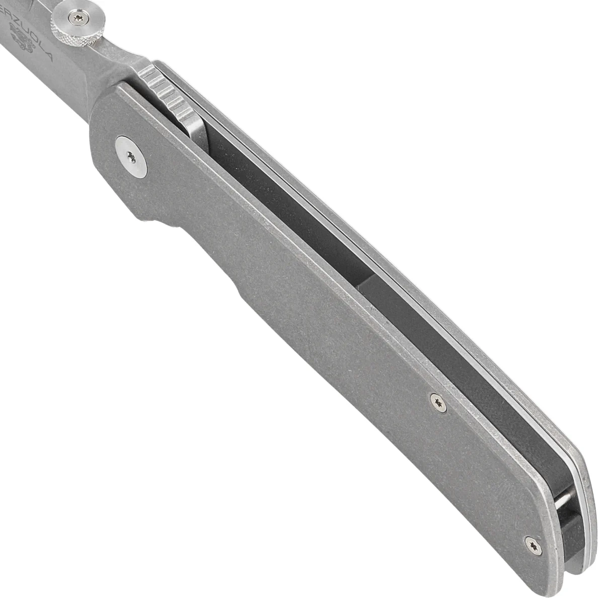 Original Gangster Coarse Stonewashed Titanium, Coarse Stonewashed, factory edition of the most famous design of the legend of world knifemaking, Bob Terzuoli, ATCF (Advanced Tactical Combat Folder) knife. This remarkable tool combines simplicity of line with exceptional functionality and superior materials. Blade of this knife is made of what is currently considered the best CPM MagnaCut knife steel. Handle made of titanium, a lightweight, extremely durable material that is prized in the knife world for its durability. The Original Gangster is not only a tool, but also an expression of artisanal precision. Every detail, every finish is meticulously crafted by the masters at Maniago, which guarantees not only excellent quality, but also the uniqueness of each piece. An elegant, functional knife that will stand out in your collection. It is not only a tool, but also an expression of the passion and skill of master knife craftsmen. It is a combination of beauty and functionality that any knife lover is sure to appreciate.