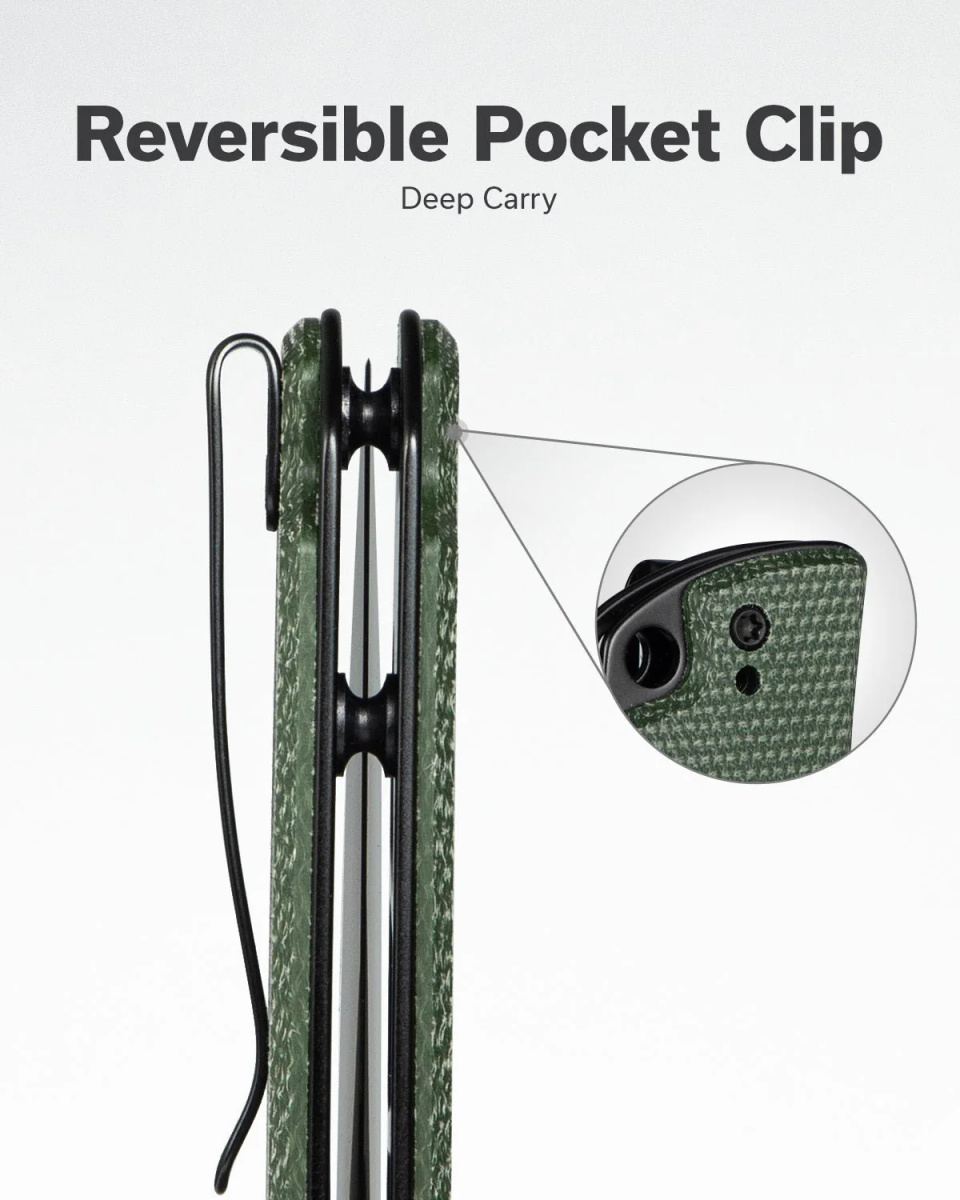 Handle - made of Canvas Micarta, a composite of canvas and synthetic resin, a material practically insensitive to weather, high and low temperatures. The chamfered edges of the covers eliminate sharp edges for comfort, and the fore finger groove made on the front improves grip security. The open-backed design fixed with steel spacer sleeves reduces weight and makes cleaning easier. Two-position, right/left deep carry clip allows you to carry the knife discreetly in your pocket in tip-up position (blade tip up).