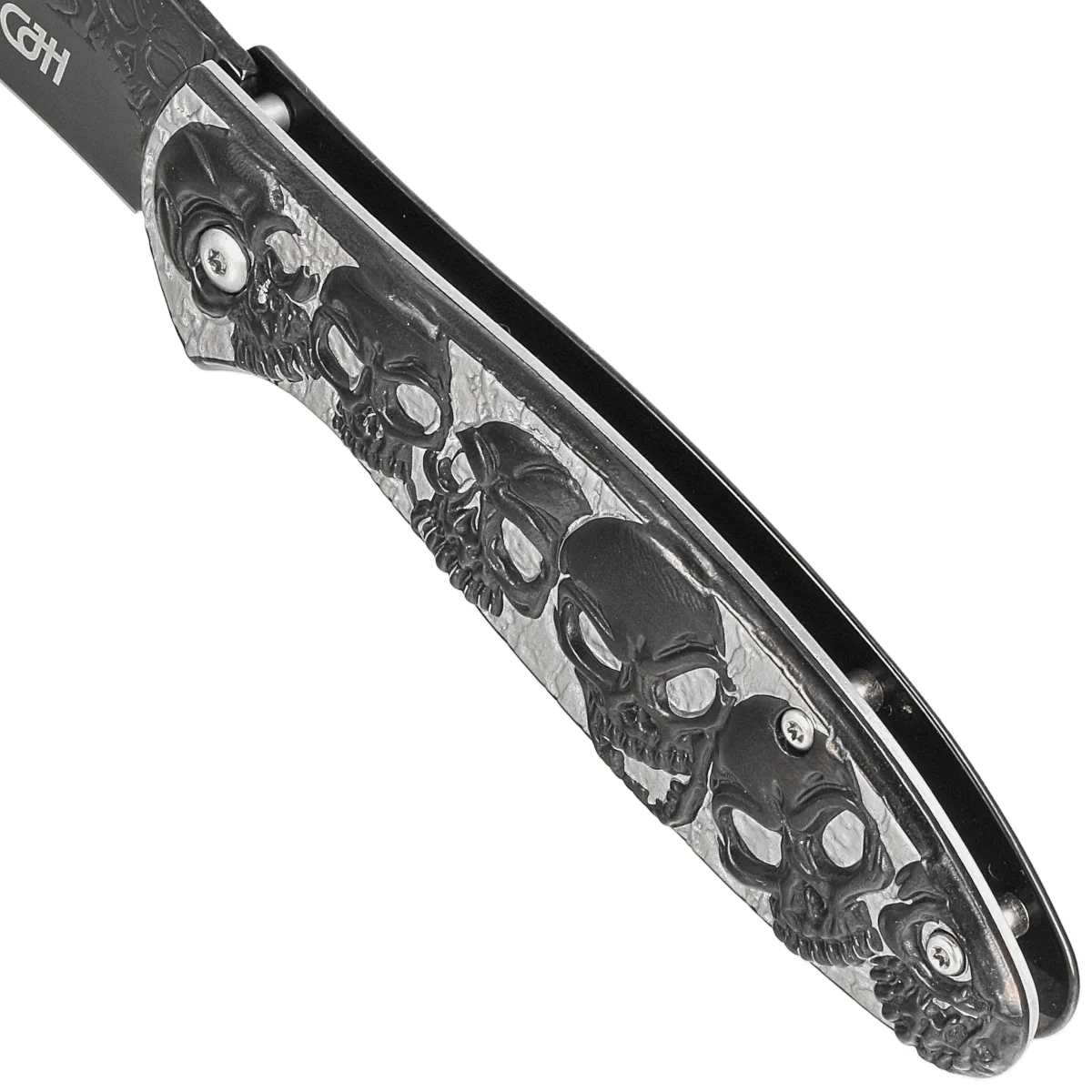- Skulls Stainless Steel, Titanium Coated, a compact folding knife from the renowned CJH Herbertz , featuring a skulls motif on the Handle and blade. Blade of drop point type made of 420 steel, ensures that the knife will do any job you put in front of it