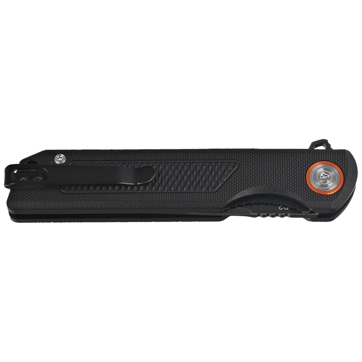 Handle - grips made of G10 composite, practically indestructible plastic, insensitive to weather conditions, resistant to chemicals and mechanical damage. The rough texture and milled texture support a secure grip. The solid backspacer to which the grips are attached guarantees the rigidity and strength of the entire structure. The simplicity and solidity of the construction give the assurance of many years of use. The single-position clip (right), made of stainless steel, allows the knife to be carried in tip-up position. Above the clip a lanyard hole, a place for a safety or decorative cord.