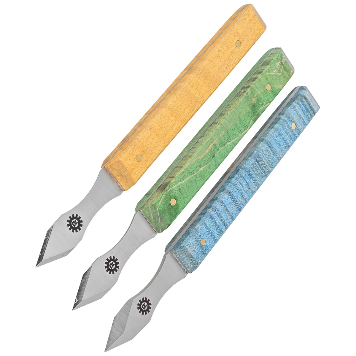 Durable Stainless Steel Blades – precisely ground and equipped with ergonomic finger grooves for a secure grip and accurate cutting control. The set includes blades in thicknesses of 0.75 mm, 1.2 mm, and 2.5 mm, allowing users to adapt to various tasks – thinner blades for detailed scribing and thicker ones for enhanced durability.