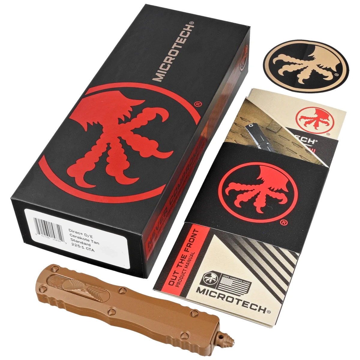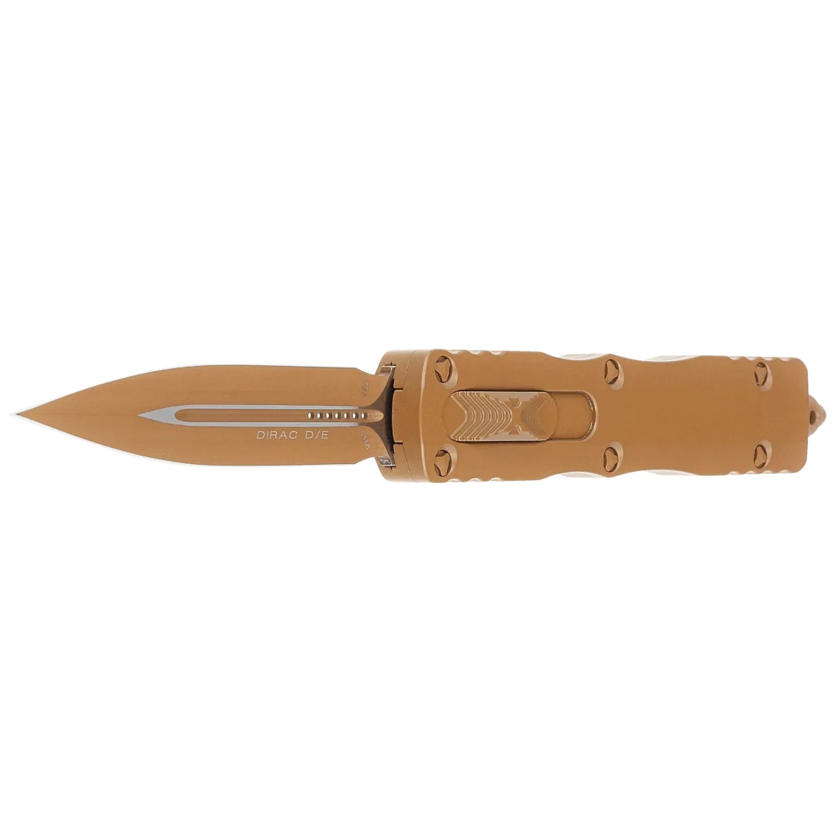 Dirac D/E Cerakote Tan Aluminum, Cerakote Tan is a compact OTF automatic knife from the Dirac series. Operating in D/A mode, it features a hellishly fast blade extension mechanism. Slider button on the side of the handle. 100% made and assembled in the USA. Designed by Anthony Marfione, knifemaker and owner of Microtech Knives.