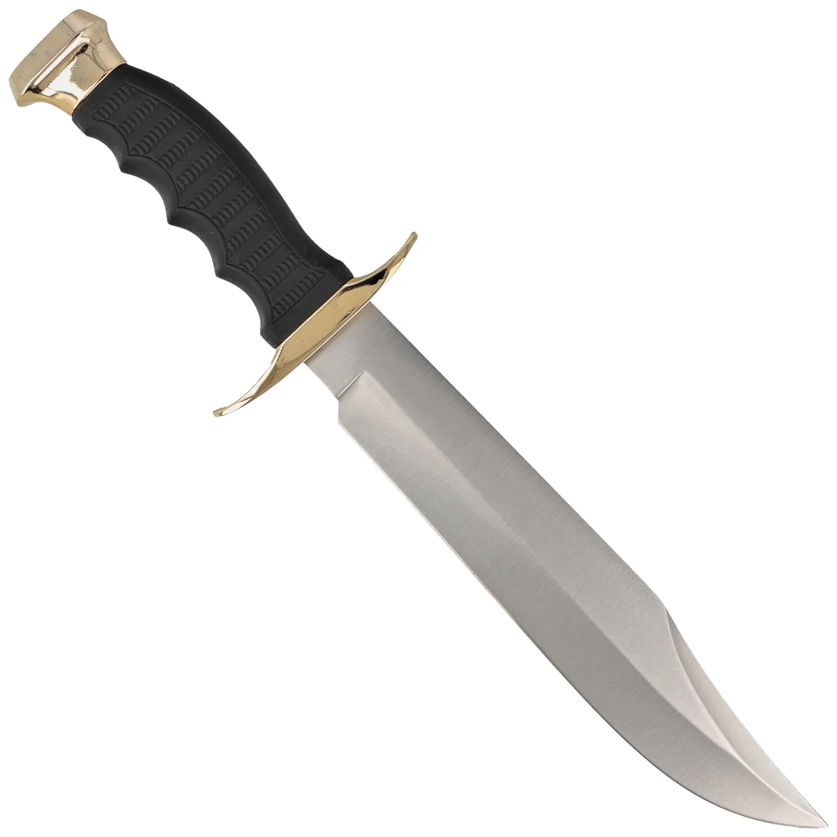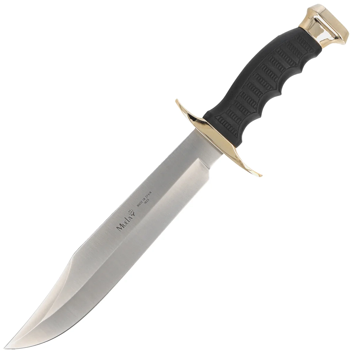 - 95-220 Black Rubber, Satin, large survival knife made of 420H stainless steel. The textured elastomer handle scales provide a comfortable and secure grip. Comes with a hand-stitched leather sheath. A perfect fusion of tradition and modernity in one tool!