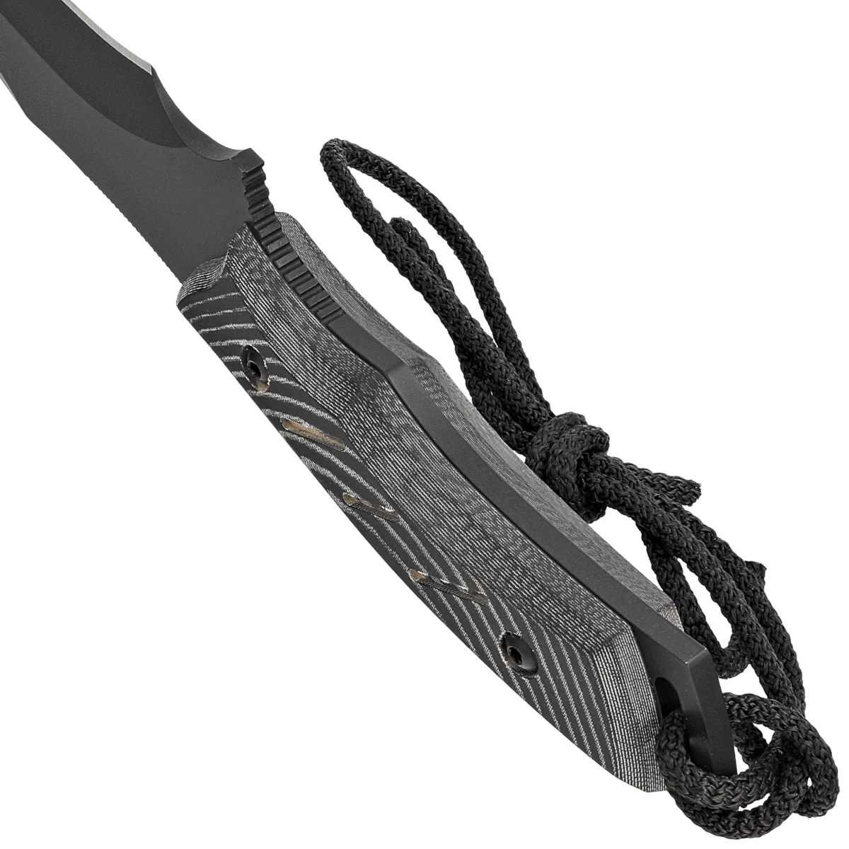 Blade - with a modified Clip Point profile, covered with a black protective coating. Plain type blade, derived with a hollow grind, gives excellent cutting edge geometry and extreme cutting performance. Notched thumb rest (ramp) on the back of the blade. Finger Choil profiled undercut for the index finger between the Handle and the cutting edge makes it easier to control the knife. The low descending line of the Blade creates a mini Guard to protect the hand from slipping on the blade.