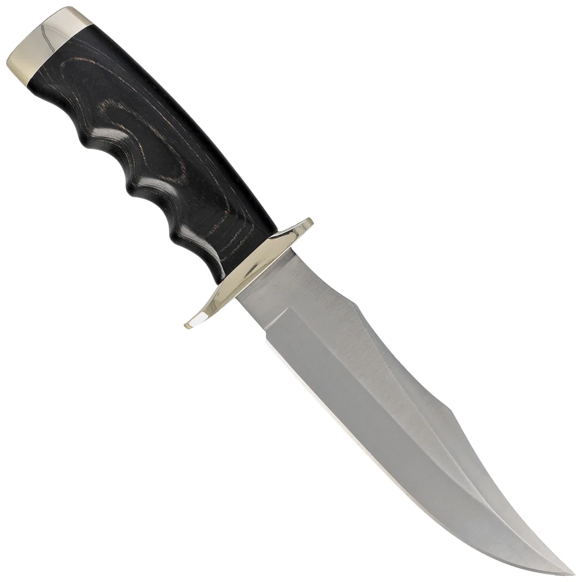 Buffalo-17M Black Pakka Wood, Satin, a large knife crafted from 440 stainless steel, ensuring enhanced blade hardness and durability. The pakka wood handle provides a comfortable and secure grip. Included is a hand-stitched leather sheath. Designed to be a reliable and highly versatile tool for a variety of outdoor applications.
