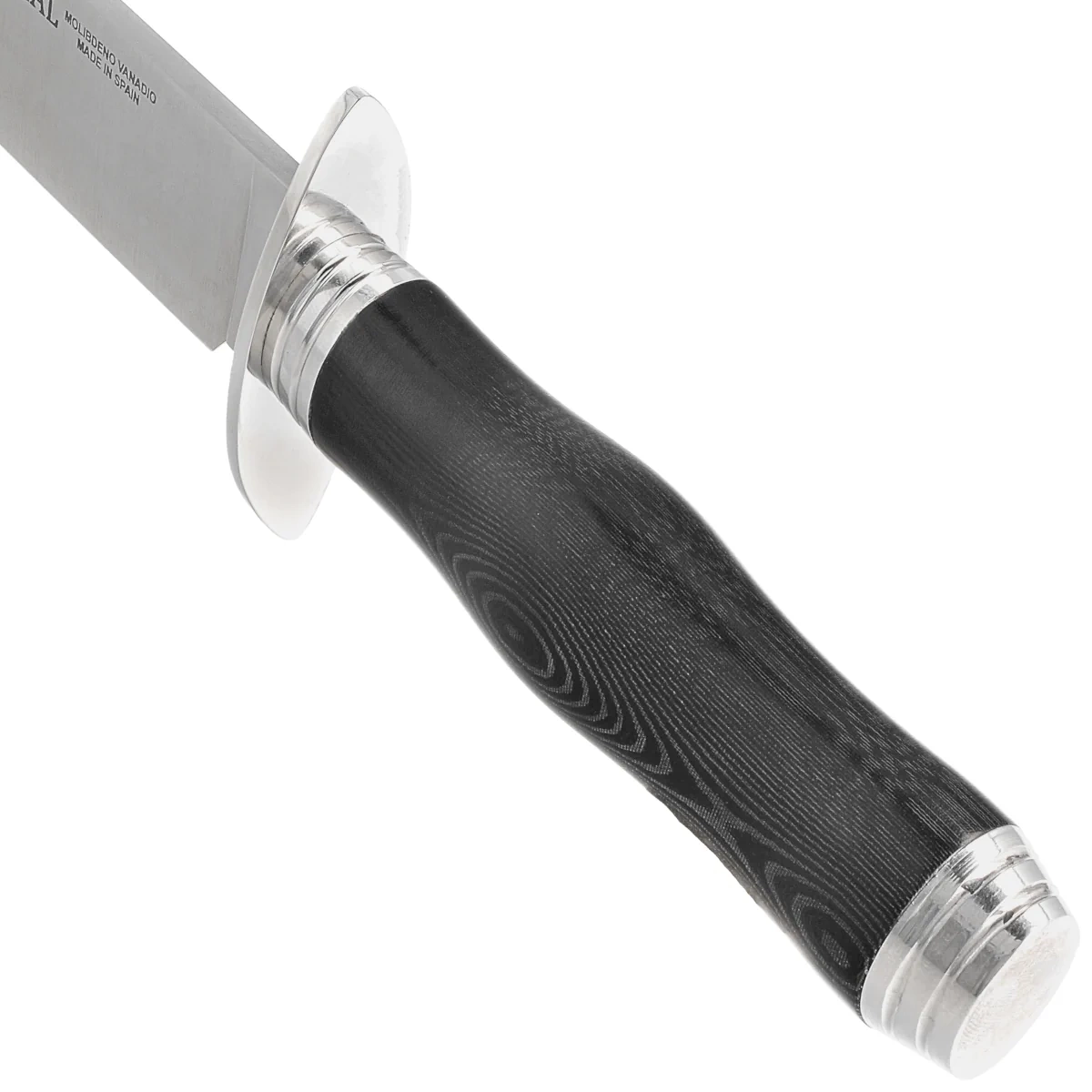 Blade - wide Clip Point type blade finished elegantly Satinized. Despite its thickness, the high, flat grind provides excellent cutting qualities combined with excellent durability. The long false blade increases piercing properties. Guard made of zinc-aluminum alloy on both sides protects fingers from slipping on the blade during work.