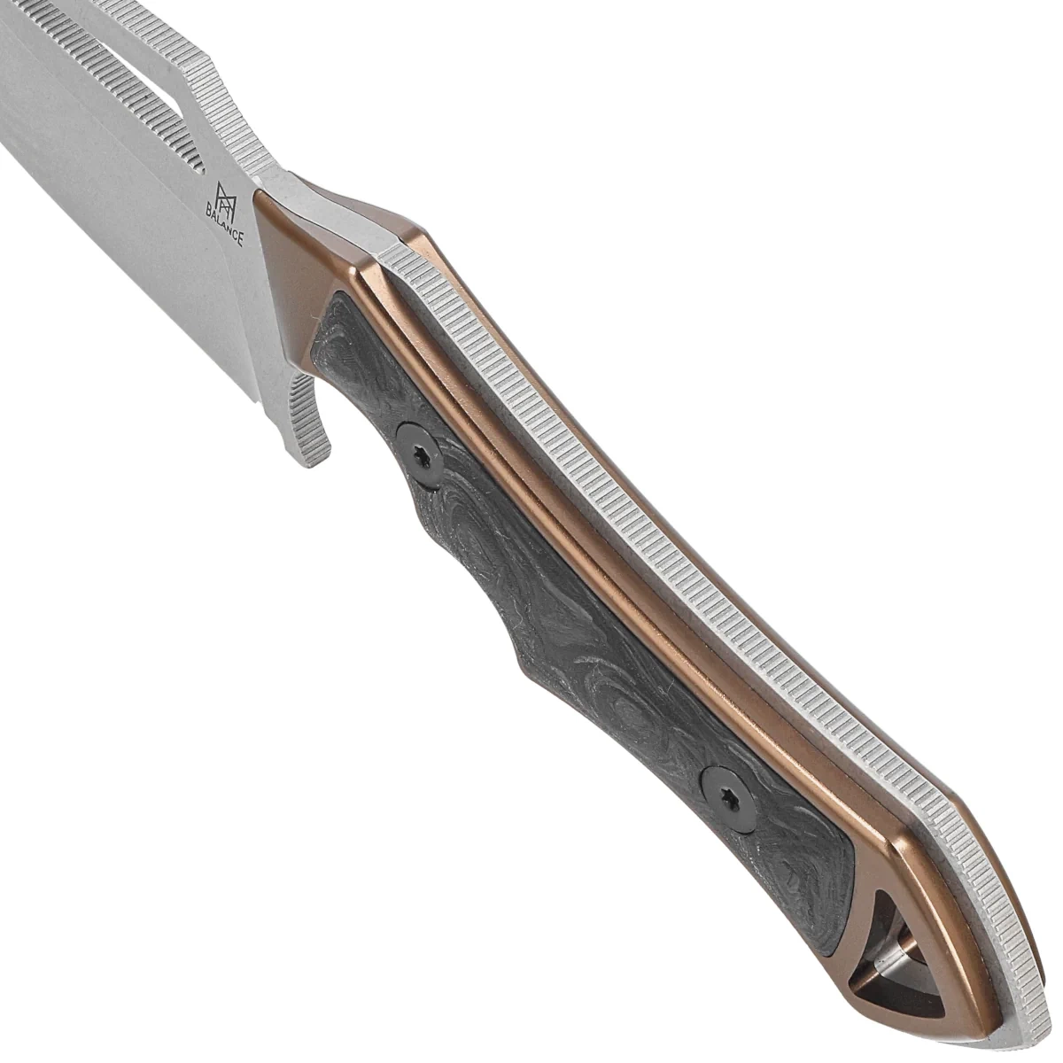 Handle - made of aluminum, a virtually indestructible metal insensitive to weather conditions, resistant to chemicals and mechanical damage, screwed directly to the blade, which ensures a durable construction. Perfectly-fitted Carbon Fiber inlays add to the elegance. The rounded shape of the covers eliminates sharp edges. At the top and bottom you will find a notched (jimping) section to improve control of the knife. The unique ergonomics of the Handle allows for prolonged work without fatigue. The protruding part of the tango can be used in the field as a glass breaker.