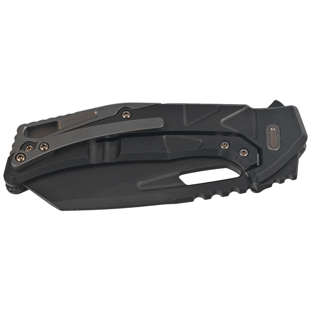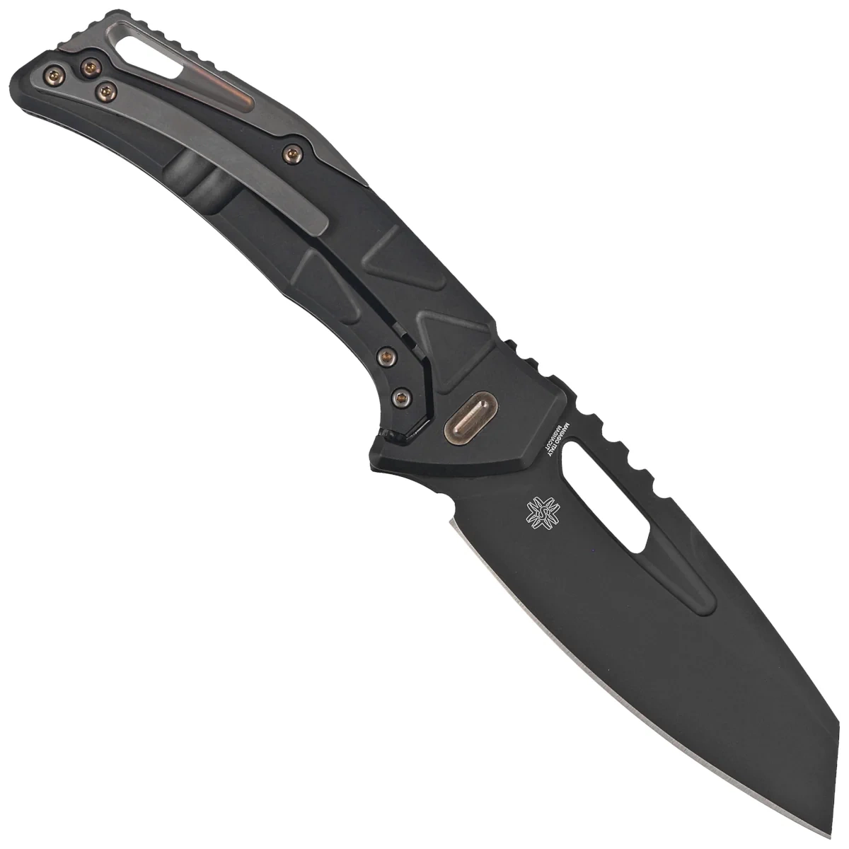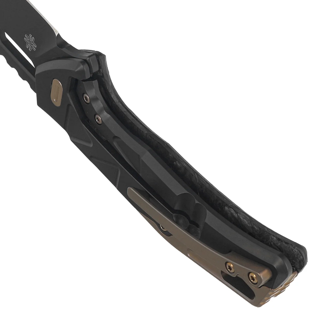 Handle - grips made of Dark Matter Fatcarbon composite. Perfectly milled with CNC machine tools, with a distinctive pattern of triangles on the Handle. in addition to visual appeal, the texture helps to maintain a firm grip. The massive backspacer gives the whole structure the desired rigidity. The simplicity and sturdiness of the construction give assurance of many years of use. Bronze accents contrast beautifully with the Fatcarbon surface. Single-position (right)clip , allows the knife to be carried in tip-up position. Above the clip a lanyard hole, a hole for threading a decorative or safety cord.
