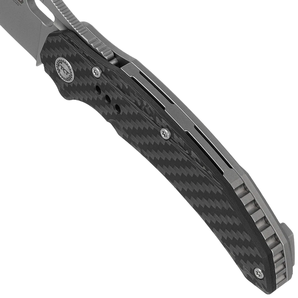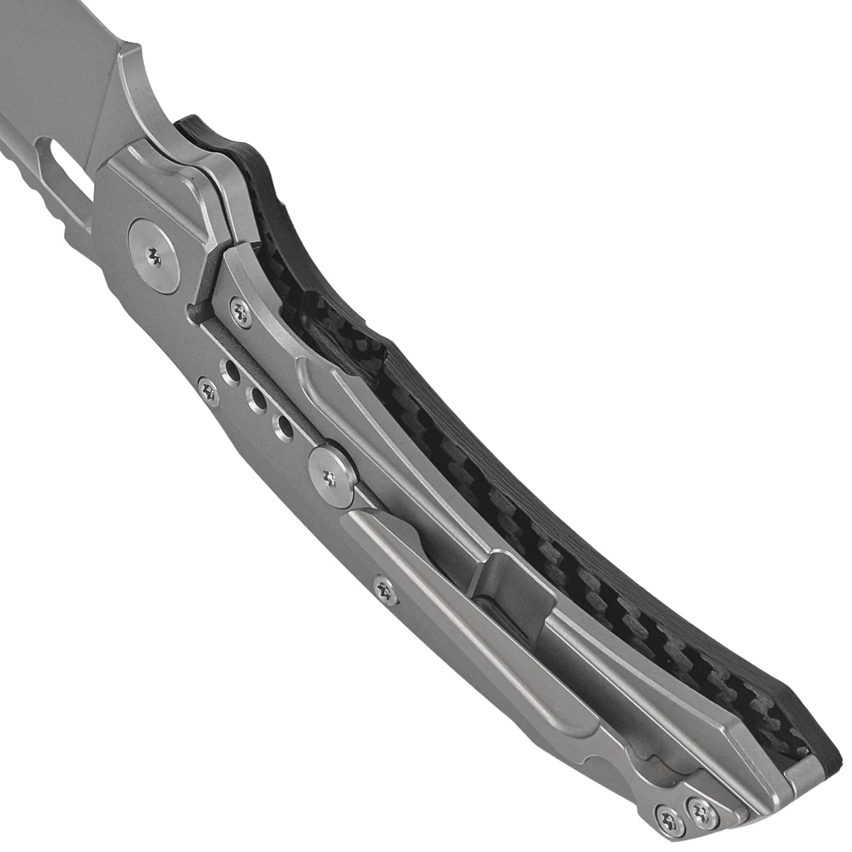 Handle - on the presentation side Carbon Fiber composite, practically indestructible plastic insensitive to weather conditions, resistant to chemicals and mechanical damage. The lock side is solid titanium 6AL4V. Chamfered cover edges eliminate sharp edges for comfort and improve grip security. The solid titanium backspacer to which the grips are attached guarantees the rigidity and strength of the entire structure. The pivot axis decorated with the logo of the designers, Todd Knife and Tool. A single-position, right-handed titanium clip allows the knife to be carried in tip-up position, with the tip of the blade upward.