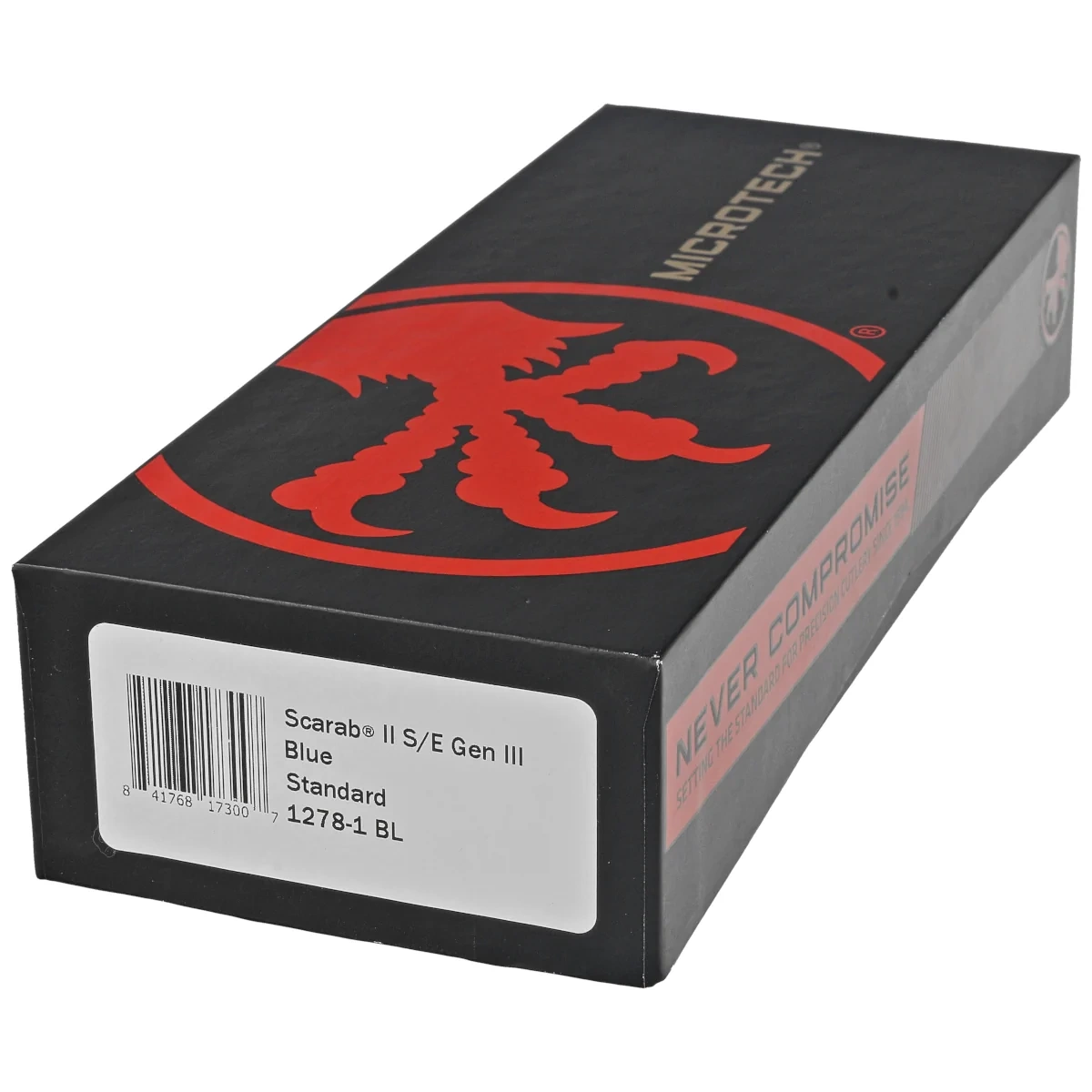 Scarab II Gen III S/E Blue Aluminum/3M, Black is the pinnacle of excellence in automatic tactical knives, taking inspiration from the original Microtech Ultratech design. Built to withstand the toughest conditions, the new Scarab II is the ultimate choice for heavy use. While retaining the styling features of its predecessor, it sets a new standard for OTF (Out The Front) technology.