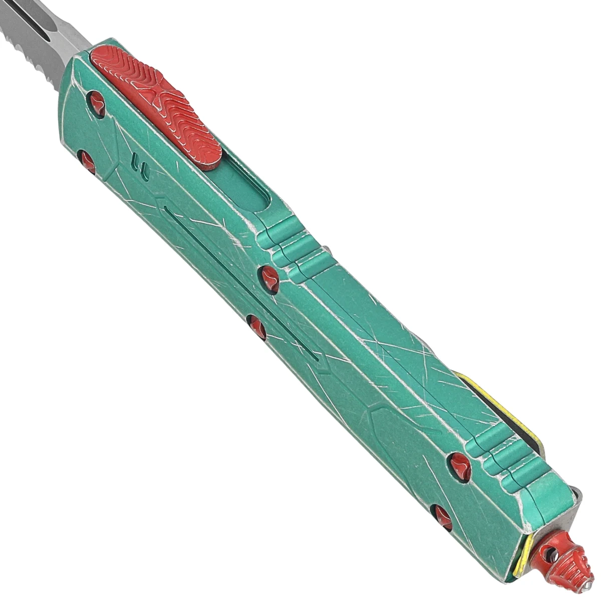 Ultratech S/E Bounty Hunter Signature Distressed Green Aluminum, Apocalyptic P/S full-size OTF (Out The Front) automatic knife from Ultratech 's Signature series line. Fully deserves to become part of the equipment of the Mandalorian Bounty Hunter. Color-wise it refers to the most famous Beskar armor belonging to the legendary Boba Fett. The deeply engraved Mythosaur skull symbol is a symbol of belonging to a clan of proud warriors! Equipped with a hellishly fast mechanism that extends a razor-sharp blade. 100% made and assembled in the USA. Designed by Anthony Marfione, knifemaker and owner of Microtech Knives.