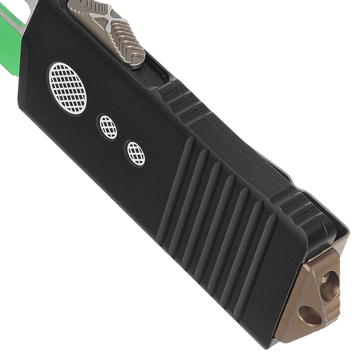 Exocet T/E Jedi Master Black Aluminum, Green is a compact OTF (Out The Front) automatic knife with “Money Clip” function. Operating in D/A mode, it features a hell of a fast blade extension mechanism. 100% made and assembled in the USA. Designed by Anthony Marfione, knifemaker and owner of Microtech Knives.