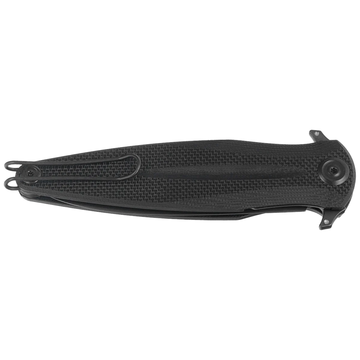 Blade - Dagger type, sharpened on one side, covered with black DLC coating. The light belly extends the length of the cutting edge relative to the length of the blade converging toward the needle-sharp tip of the knife. The light thickness combined with the high flat grind (Flat Grind) gives excellent cutting properties and the long grain with a hole increases the strength of the blade. Ball bearings support the smooth operation of the blade's opening mechanism, which can be opened with a quick flipper (index-finger flipper). When opened, the flipper forms a mini-guard to prevent your hand from slipping on the blade. On the other side we also have a guard, on both of which are fluorescent dots made of Swiss Superluminova material making it easier to find the knife in the dark. The whole is locked with a proven and popular liner lock.
