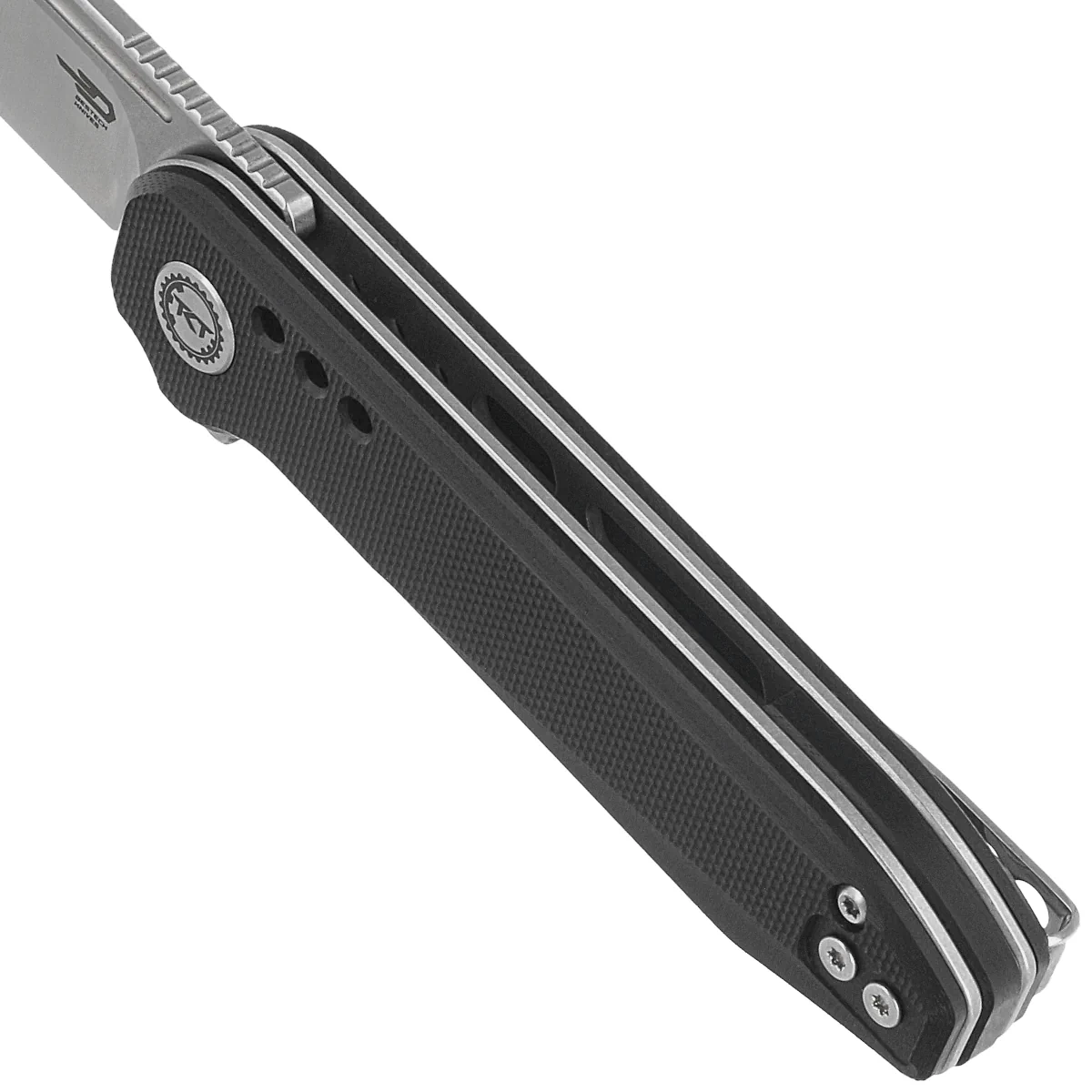 Handle - scales made of black G10 composite, a material insensitive to weather conditions, resistant to chemicals and mechanical damage Chamfered edges of the covers eliminate sharp edges and texturing of the surface improves grip security. The backspacer to which the grips are attached guarantees the rigidity and strength of the entire structure. Pivot axis decorated with the logo of the designers, Todd Knife and Tool. The two-position (right/left) clip allows the knife to be carried in tip-up position, with the tip of the blade upwards.