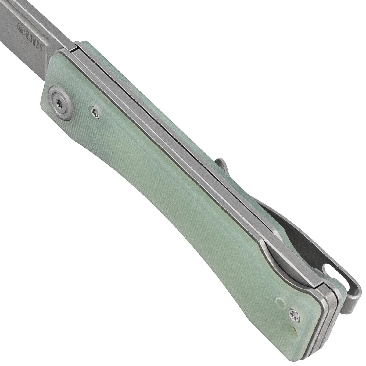 Handle - grips made of G10 composite, a material that is extremely mechanically durable and virtually completely resistant to weather and chemicals, textured for improved grip confidence, bolted to the knife's steel frame. The massive backspacer to which the grips are attached guarantees the rigidity and strength of the entire structure. The simple, solid construction gives the assurance of many years of use. The pivot axis is decorated with a stylized manufacturer's logo. A two-position (right/left) metal deep-carry clip allows you to carry the knife discreetly in your pocket in tip-up position (blade tip up). Under the clip a lanyard hole, a hole for threading a safety or decorative cord.