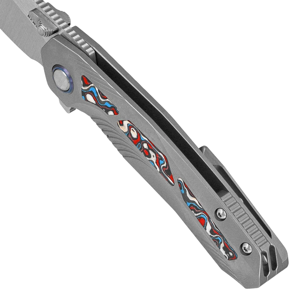 Handle - is thick pieces of titanium 6AL4V, contouring of the covers eliminates sharp edges. On both sides there is an inlay (insert) made of Multicolored Carbon Fiber composite. Only a few companies are able to make the Handle with such incredible accuracy! The grips are joined together using a titanium backspacer. A right-handed, single-position titanium deep-carry clip allows you to carry the knife discreetly in your pocket in tip-up (blade up) position. The pivot axis is decorated with a titanium rim (pivot collar cap).