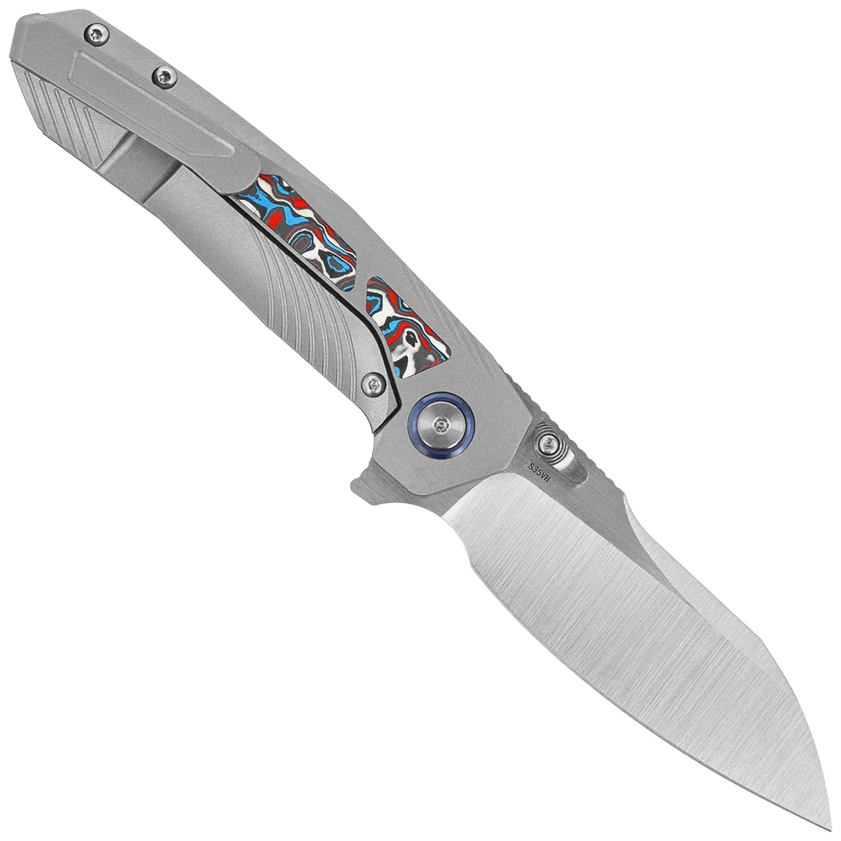 The Kestrel Gray Titanium/Multicolored Carbon Fiber, Satin is an artfully designed folding knife that combines modern technology and remarkable aesthetics. It features a Blade made of advanced CPM S35VN steel, known for its excellent corrosion resistance and high mechanical strength. Handle is a harmonious combination of titanium and carbon fiber, extremely light and comfortable. Each component is designed with the user's comfort in mind, guaranteeing a secure grip in any situation. The frame lock, made with the highest precision, guarantees safety and reliability during use. This compact EDC folder is distinguished not only by its functionality, but also by its unique design. It was created for demanding users who expect the highest quality in everyday use.