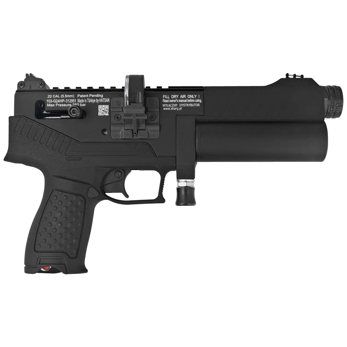 • Velox Black .25 a semi‑automatic PCP pistol from Hatsan with a semi‑auto reloading system. Ideal for dynamic shooting. Two 50cc air tube, filled to 250 bar, ensure long-lasting shooting. Available in 4.5 mm, 5.5 mm, and 6.35 mm calibers.