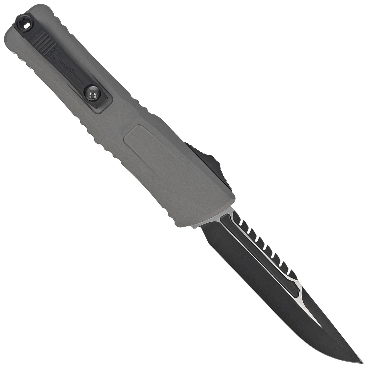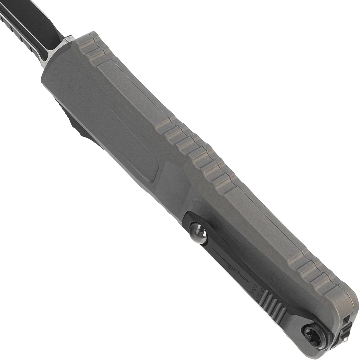 Combat Troodon Gen III Interceptor Signature Natural Clear Aluminum, Black the largest of the automatic knives, is the pinnacle of precision engineering and tactical efficiency in the field of OTF (Out The Front) knives. Built for a wide range of utility applications, it boasts a 25% larger size compared to the flagship Troodon. Precision-crafted, equipped with a sophisticated and extremely fast retractable mechanism, and a new type of razor-sharp blade - Interceptor. 100% manufactured and assembled in the USA. Designed by Anthony Marfione, knifemaker and owner of Microtech Knives.