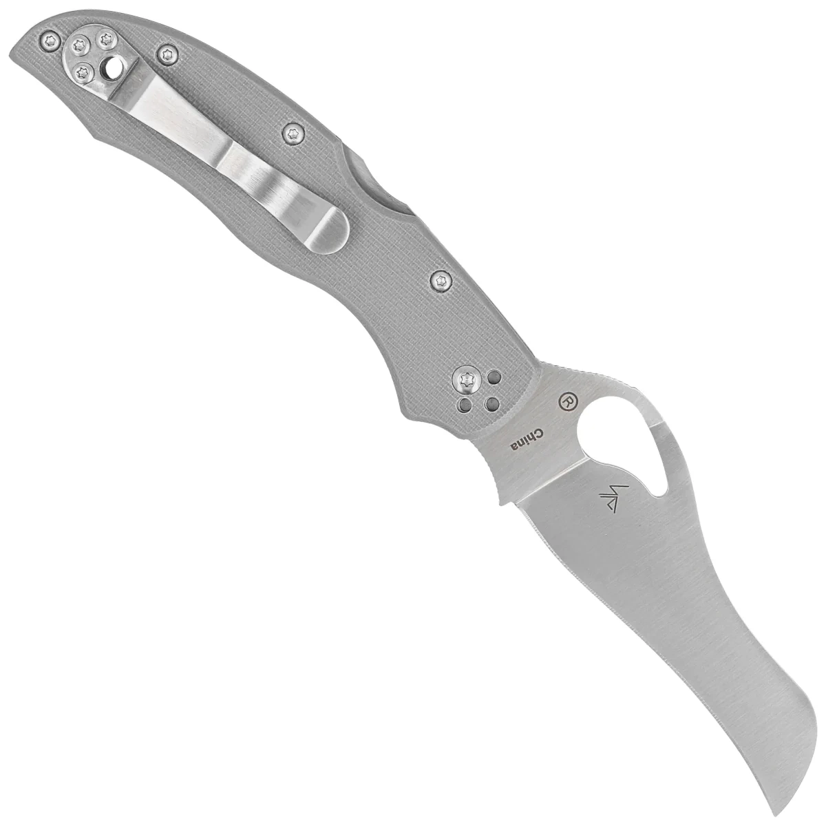 • Gooney Gray G10, Satin. An unusual combination of the Spyderco sheepfoot, hawkbill and patent blade profiles, with an inverted “S” shape. The result is a very versatile blade with excellent cutting properties. Grips made of durable G10 composite.