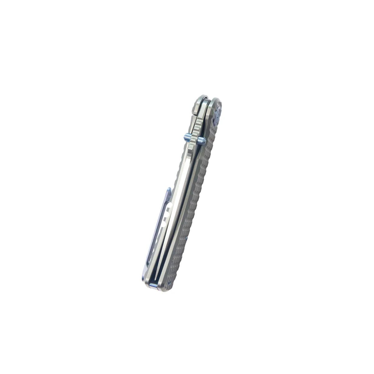 Handle - milled titanium 6AL4V, beveled edges of the covers eliminate sharp edges. The characteristic texture of the handle imitating the surface of a fragmentation grenade (Frag Pattern) not only looks good, but also prevents the knife from slipping in the hand during use. The whole is screwed to a solid backspacer, also made of titanium. The pivot axis is decorated with a titanium cap (Pivot Cap) in a contrasting color. The single-position (right) titanium deep carry clip allows you to carry the knife discreetly in your pocket in a tip-up position (with the tip of the blade up).