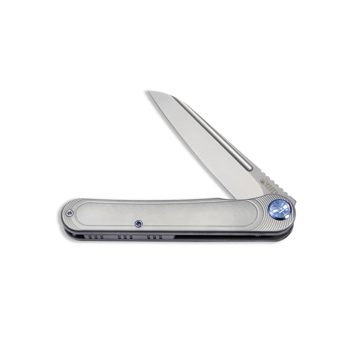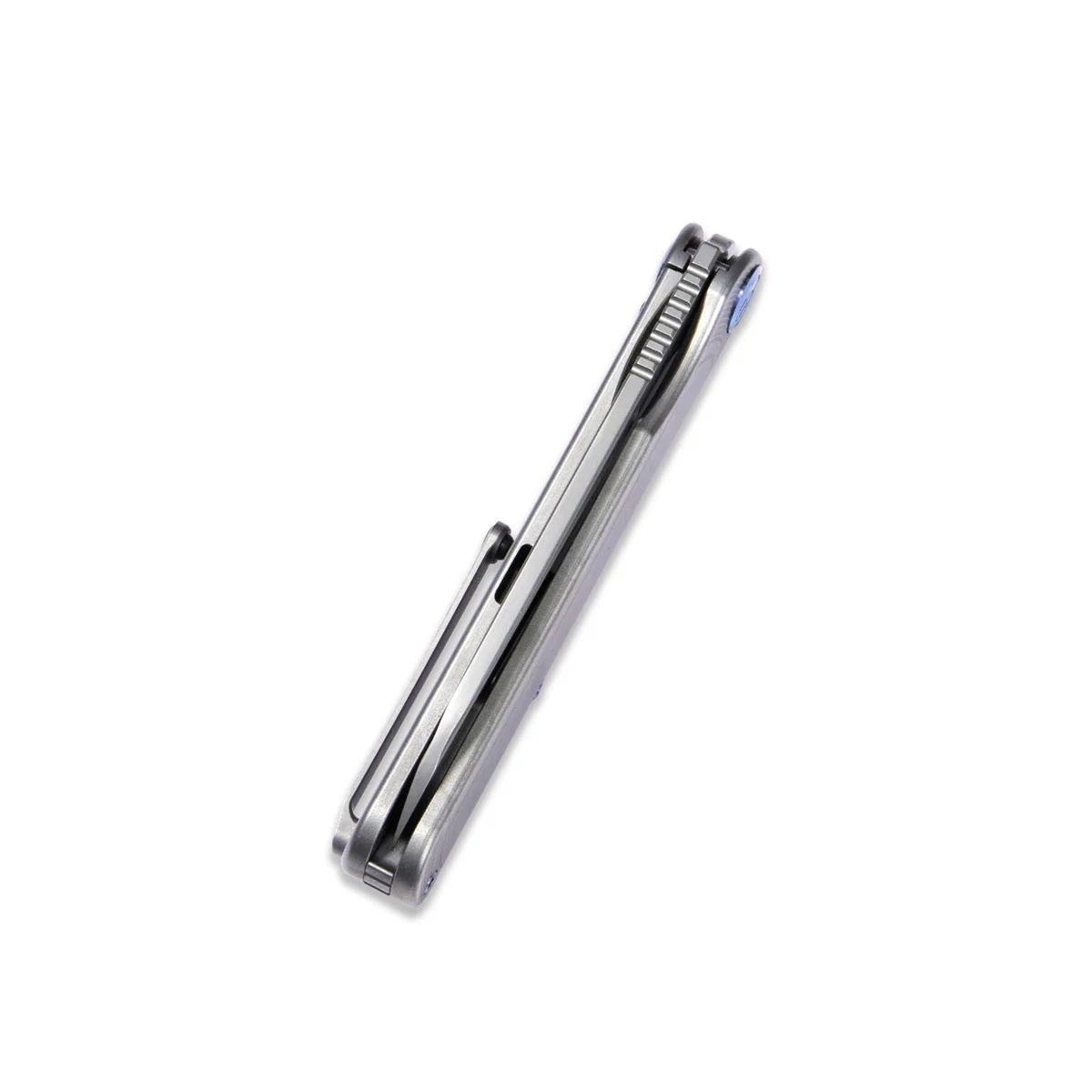 Handle - profiled grips made of titanium 6AL4V. The whole is screwed to a solid backspacer, also made of titanium. The simple, solid construction ensures many years of use. The pivot axis is decorated with a titanium cap (Pivot Cap) in a contrasting color. The single position (right) titanium deep carry clip allows you to carry the knife discreetly in your pocket in a tip-up position (with the tip of the blade up). At the back of the backspacer there is a hidden place to thread a safety or decorative cord.