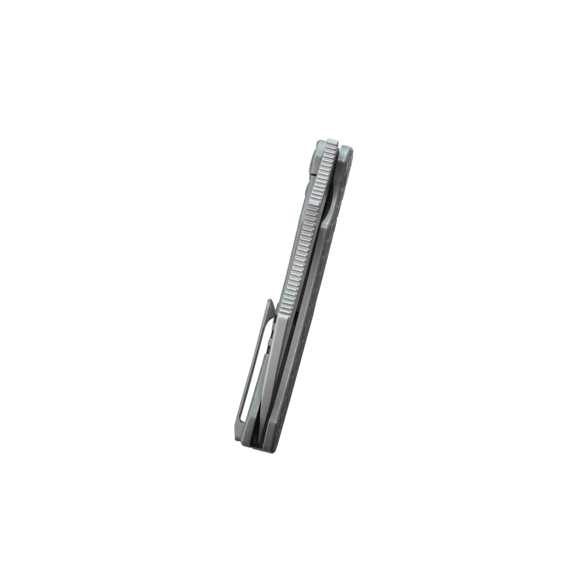 Handle - milled titanium 6AL4V, beveled edges of the covers eliminate sharp edges. The distinctive texture of the handle, imitating a frag pattern, not only looks good but also prevents the knife from slipping in the hand during use. The whole thing is screwed onto a solid backspacer, also made of titanium. Pivot cap made of titanium in a contrasting color. Forefinger groove improves grip. Single-position (right) titanium deep carry clip allows you to carry the knife discreetly in your pocket in a tip-up position (with the tip of the blade up).