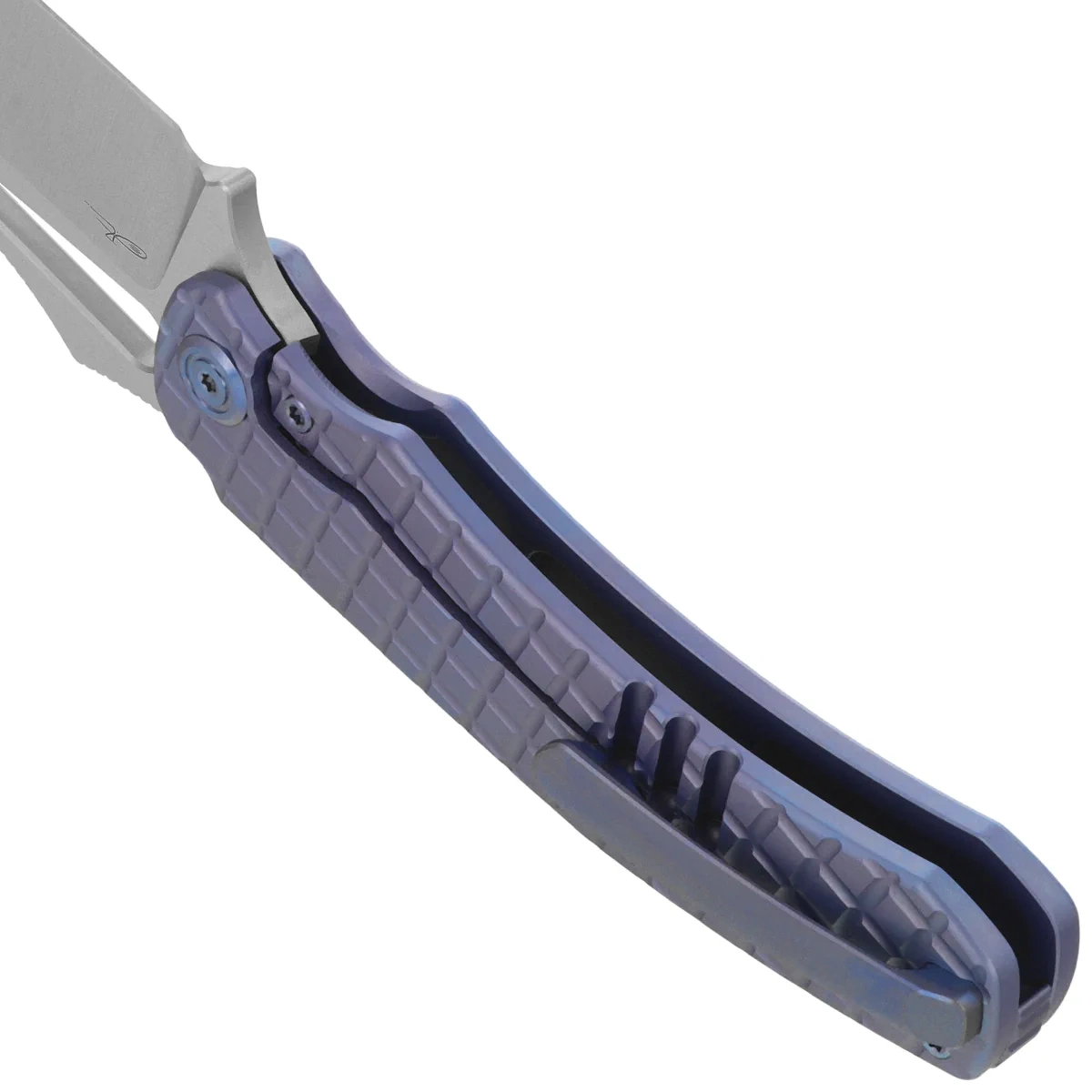 Handle - milled titanium 6AL4V, beveled edges of the covers eliminate sharp edges. The characteristic texture of the handle imitating the surface of a fragmentation grenade (Frag Pattern), in addition to its visual qualities, prevents the knife from slipping in the hand during use. The whole is screwed to a solid backspacer, also made of titanium. Pivot cap made of titanium in a contrasting color. Forefinger groove for a secure grip. Single-position (right) titanium deep carry clip allows you to carry the knife discreetly in your pocket in a tip-up position (with the tip of the blade up).