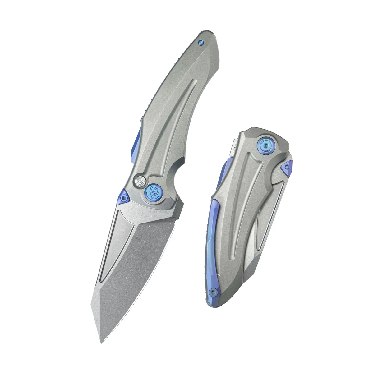 Handle - grips made of titanium 6AL4V, a material with extremely high mechanical strength and virtually complete resistance to weather conditions and chemicals. The whole is screwed to a solid backspacer, also made of titanium 6AL4V. The simple, solid design ensures many years of use. The forefinger groove improves grip and creates a mini guard to prevent the hand from slipping onto the blade. The pivot axis is decorated with a stylized manufacturer's logo. The single-position (right) titanium deep carry clip allows you to carry the knife discreetly in your pocket in a tip-up position (with the tip of the blade up).
