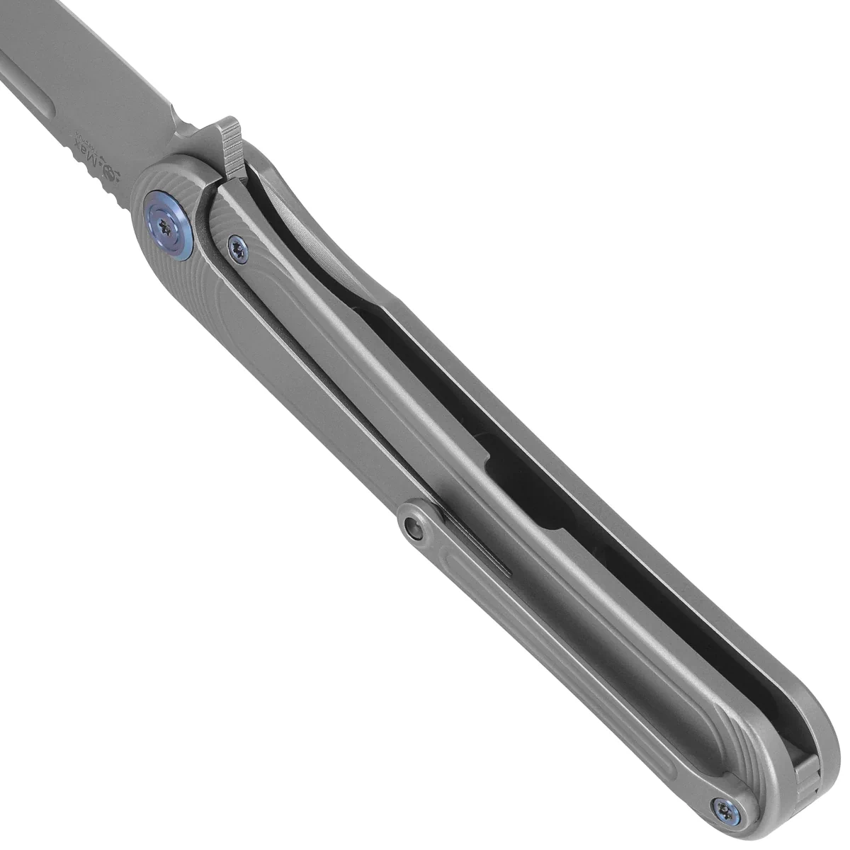 Handle - profiled grips made of titanium 6AL4V. The whole is screwed to a solid backspacer, also made of titanium. The simple, solid construction ensures many years of use. The pivot axis is decorated with a titanium cap (Pivot Cap) in a contrasting color. The single position (right) titanium deep carry clip allows you to carry the knife discreetly in your pocket in a tip-up position (with the tip of the blade up). At the back of the backspacer there is a hidden place to thread a safety or decorative cord.