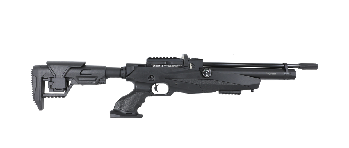 Reximex Tormenta Lite – a modern PCP air rifle housed in a compact, tactical stock with a pistol grip made from advanced polymer. This latest edition of the popular Tormenta series offers an even more affordable price, featuring a tactical AR-style telescopic stock with an adjustable cheekpiece. The rifle is equipped with a Side Lever cocking mechanism, a lightweight aluminum air cylinder, and a precision-rifled barrel. Available in calibers: .177 (4.5 mm), .22 (5.5 mm), and .25 (6.35 mm).