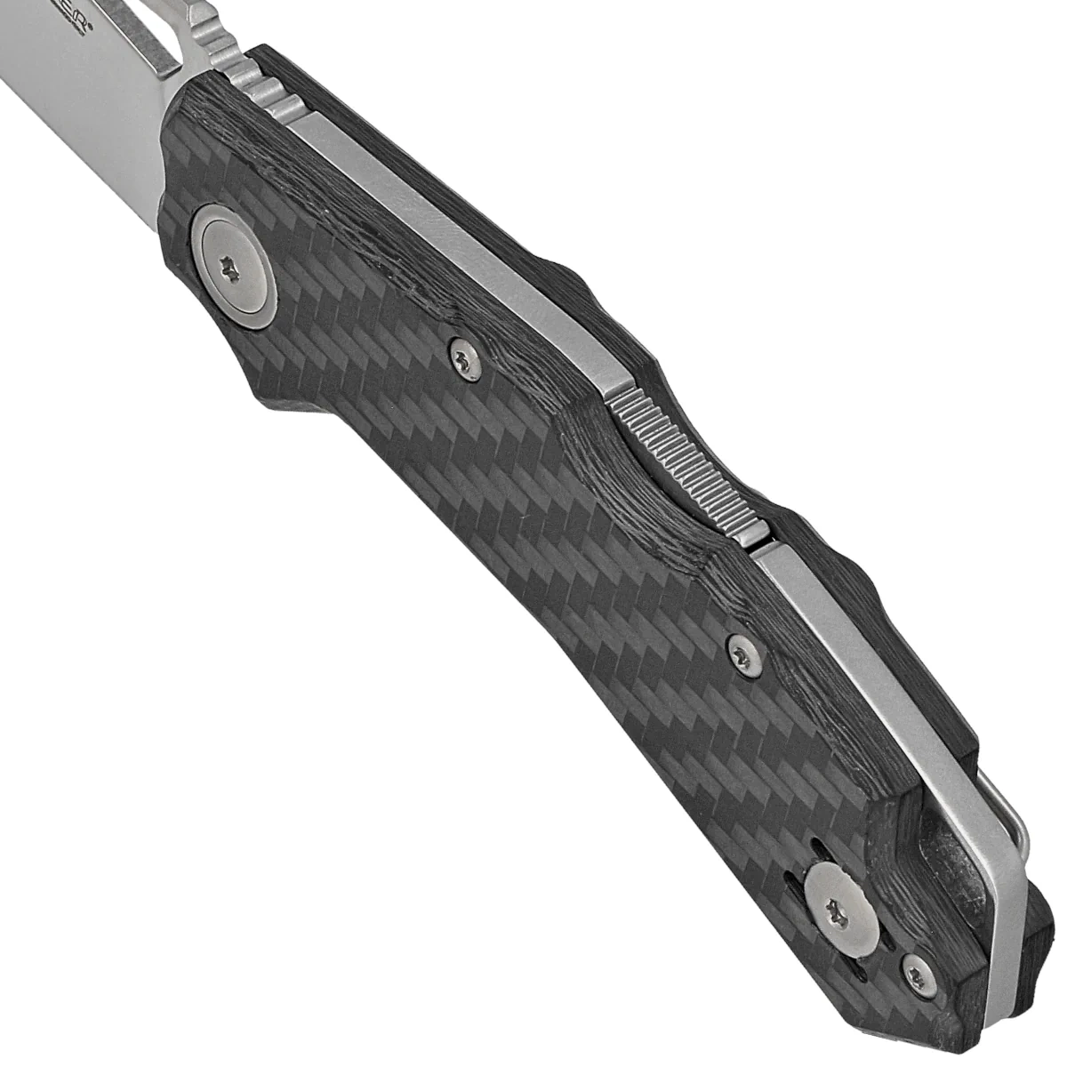 Handle - grips made of carbon fiber composite, a material with extremely high mechanical strength and virtually complete resistance to weather conditions and chemicals, are screwed to the steel frame of the knife. A solid backspacer ensures the desired rigidity. The simple, solid construction guarantees many years of use. A two-position (right/left) steel wire clip allows the knife to be carried in a tip-up position. The pivot axis is decorated with a titanium rim (pivot collar ring).
