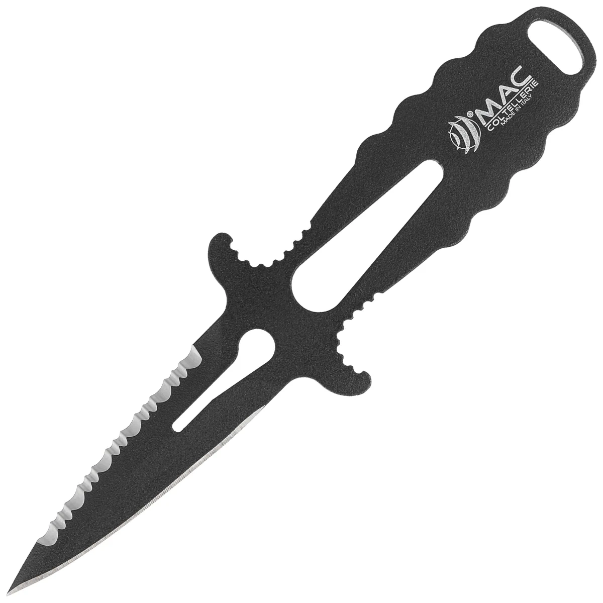 Blade - Dagger type, sharpened on both sides with excellent cutting properties, finished with a flat grind. One blade completely smooth Plain, the other completely serrated Serrated with a smooth blade a few millimeters long at the tip. The unique serrated blade consists of one large and two small teeth, alternately arranged, the so-called two-step. This pattern increases the length of the cutting edge by up to 24% compared to a smooth blade. Ideal for aggressive cutting of hard materials, plastics and fibrous materials such as ropes or nets. The notched blade can be used to lever open nails or screws under water. The blade has a black PTFE (polytetrafluoroethylene) protective coating. The blade should be cleaned in fresh water and oiled after each use.