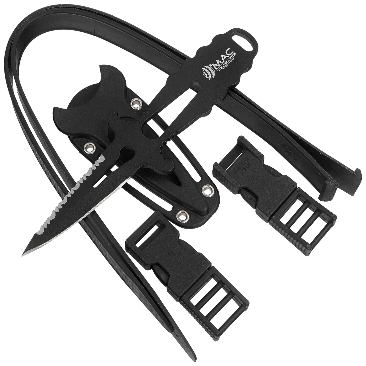Sheath - made of hard PP polymer with holes for water and moisture drainage. The sheath is equipped with a latch to prevent the knife from slipping out in the water. Two rubber straps and 2 plastic buckles are included with the sheath to allow it to be attached to the shoulder, lower leg or vest.