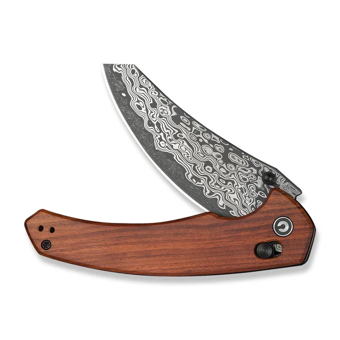 Handle - made of exotic Guibourtia wood. Beveled edges of the covers eliminate sharp edges, and the rough texture and surface patterning increase grip comfort and confidence. The open-backed design, which is attached with steel spacers, reduces weight and makes cleaning easier. The pivot axis is decorated with a stylized Civivi logo. The two-position right/left-handed deep carry clip allows you to carry the knife discreetly in your pocket in a tip-up position (with the tip of the blade facing upwards).