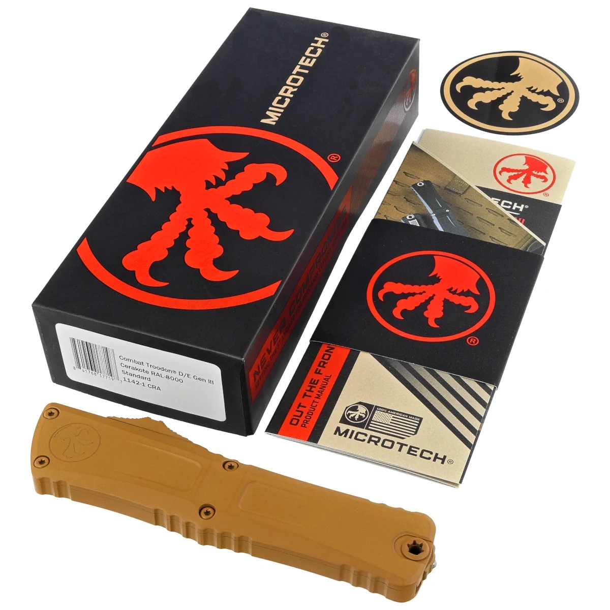 Combat Troodon Gen III D/E Cerakote RAL-8000 Aluminum, Cerakote RAL-8000 This is the largest of the automatic knives and the pinnacle of precision engineering and tactical efficiency in the field of OTF (Out The Front) knives. Built for a wide range of applications, it is 25% larger than the flagship Troodon. Precisely crafted, equipped with a sophisticated and extremely fast ejector mechanism with a razor-sharp blade. 100% manufactured and assembled in the USA. Designed by Anthony Marfione, knifemaker and owner of Microtech Knives.