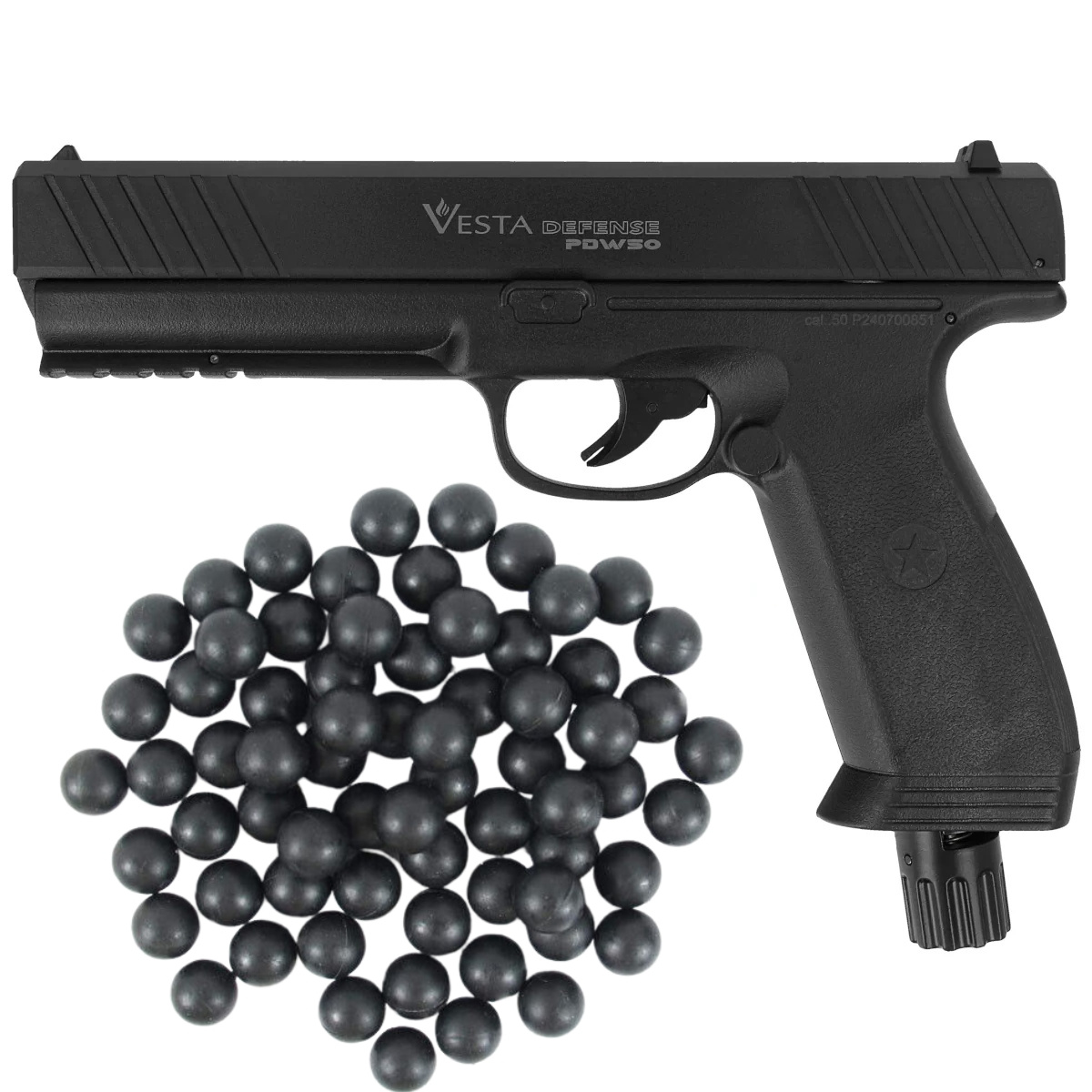 Vesta Defence PDW50 .50 Cal 17J Set + CO₂ + Rubber Balls is a comprehensive kit designed for self-defense, tactical training, and recreational shooting. The package includes a high-powered CO₂ RAM pistol, 10 ASG 12g CO₂ cartridges, and 50 RazorGun rubber balls in .50 caliber.