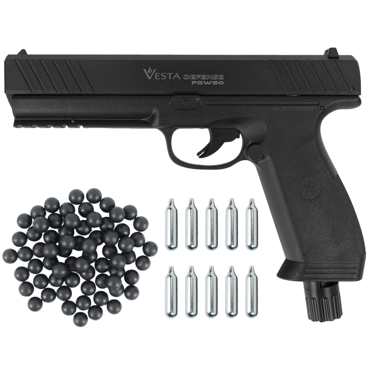 - Vesta PDW50 Set (.50 cal, 17 J) – a ready-to-go solution for defense, training, and recreation. Includes a CO₂-powered marker, 100 rubber rounds, and 10 cartridges—delivering power, precision, and full operational readiness.