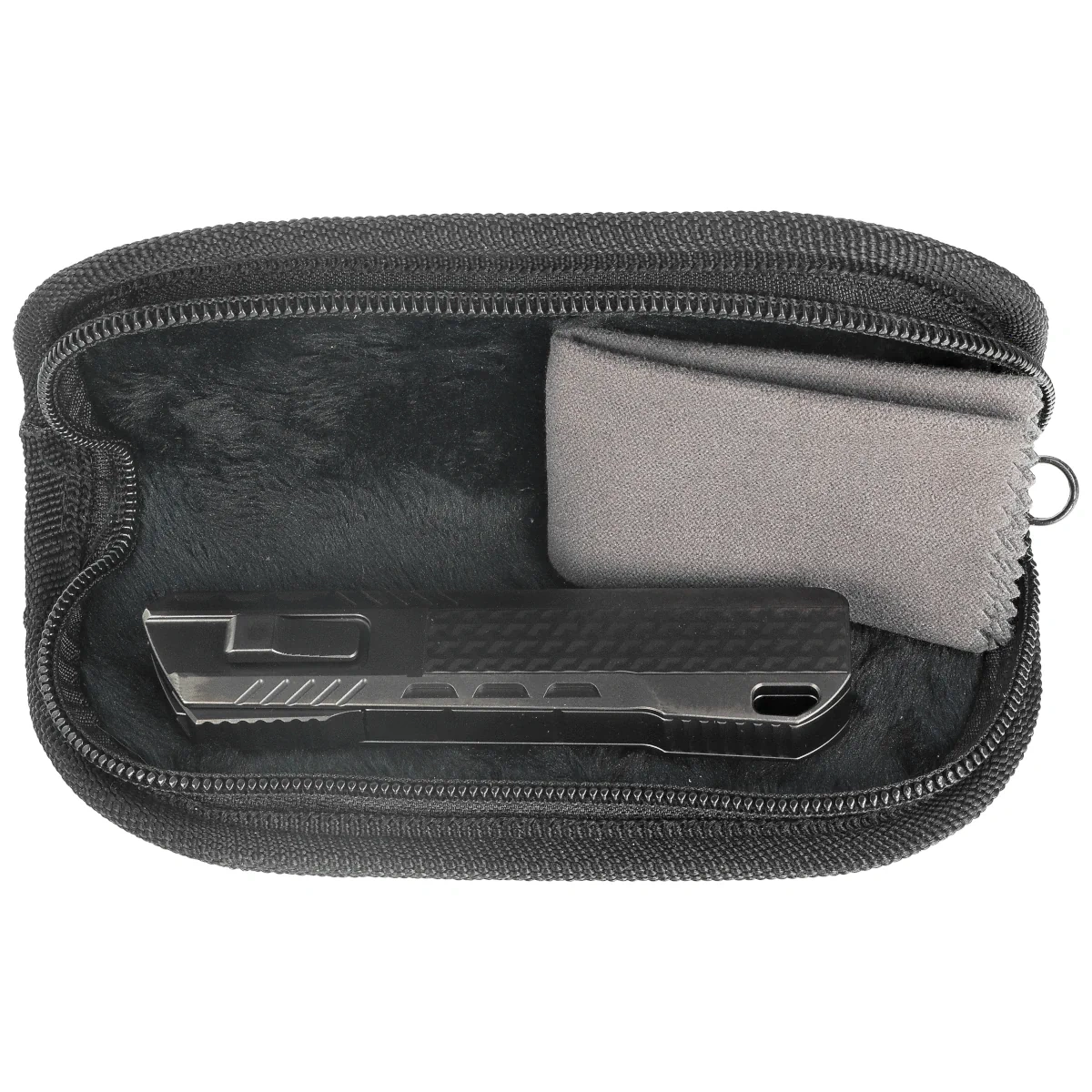 Handle - made on CNC milling machines from titanium also coated with black DLC. Beveled edges of the covers with three-dimensional texture eliminate sharp edges and improve grip. On the right side, there is an elaborate slider for extending/retracting the blade. The single-position titanium (right) deep carry clip allows the knife to be carried discreetly in the pocket in a tip-down position (with the tip of the blade facing down).