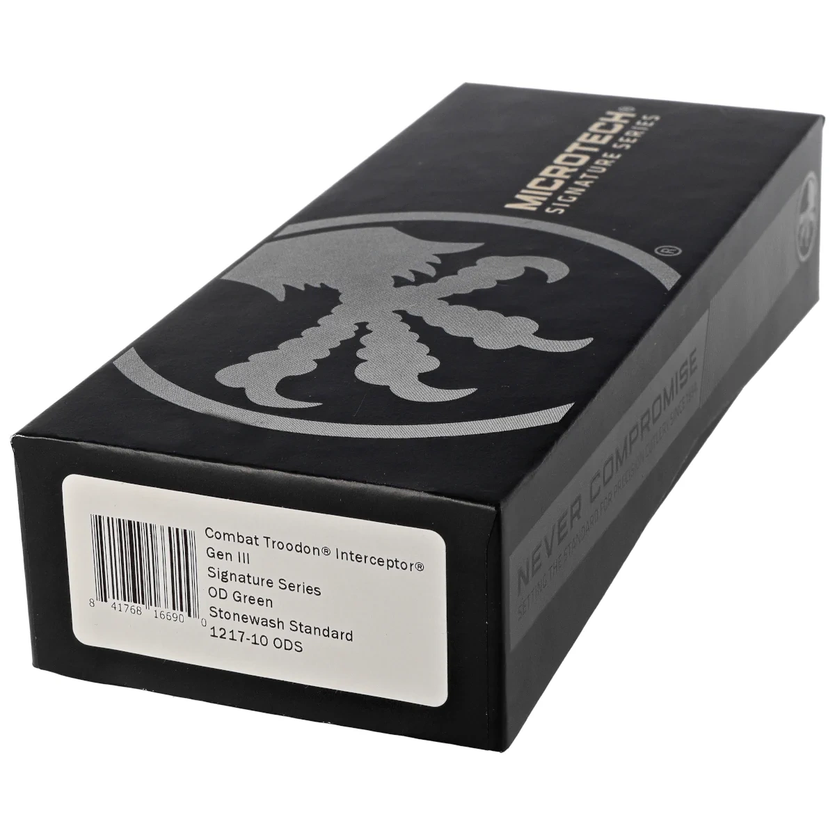 Combat Troodon Gen III Interceptor Signature OD Green Aluminum, Stonewashed the largest of the automatic knives, is the pinnacle of precision engineering and tactical efficiency in the field of OTF (Out The Front) knives. Built for a wide range of utility applications, it boasts a 25% larger size compared to the flagship Troodon. Precision-crafted, equipped with a sophisticated and extremely fast retractable mechanism, and a new type of razor-sharp blade - Interceptor. 100% manufactured and assembled in the USA. Designed by Anthony Marfione, knifemaker and owner of Microtech Knives.