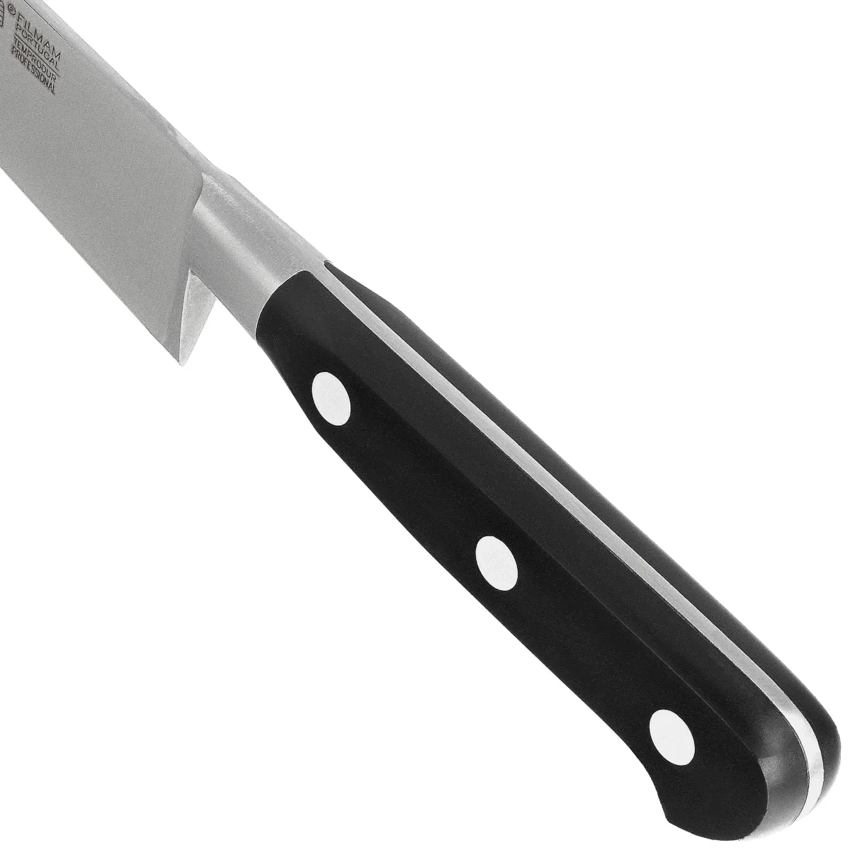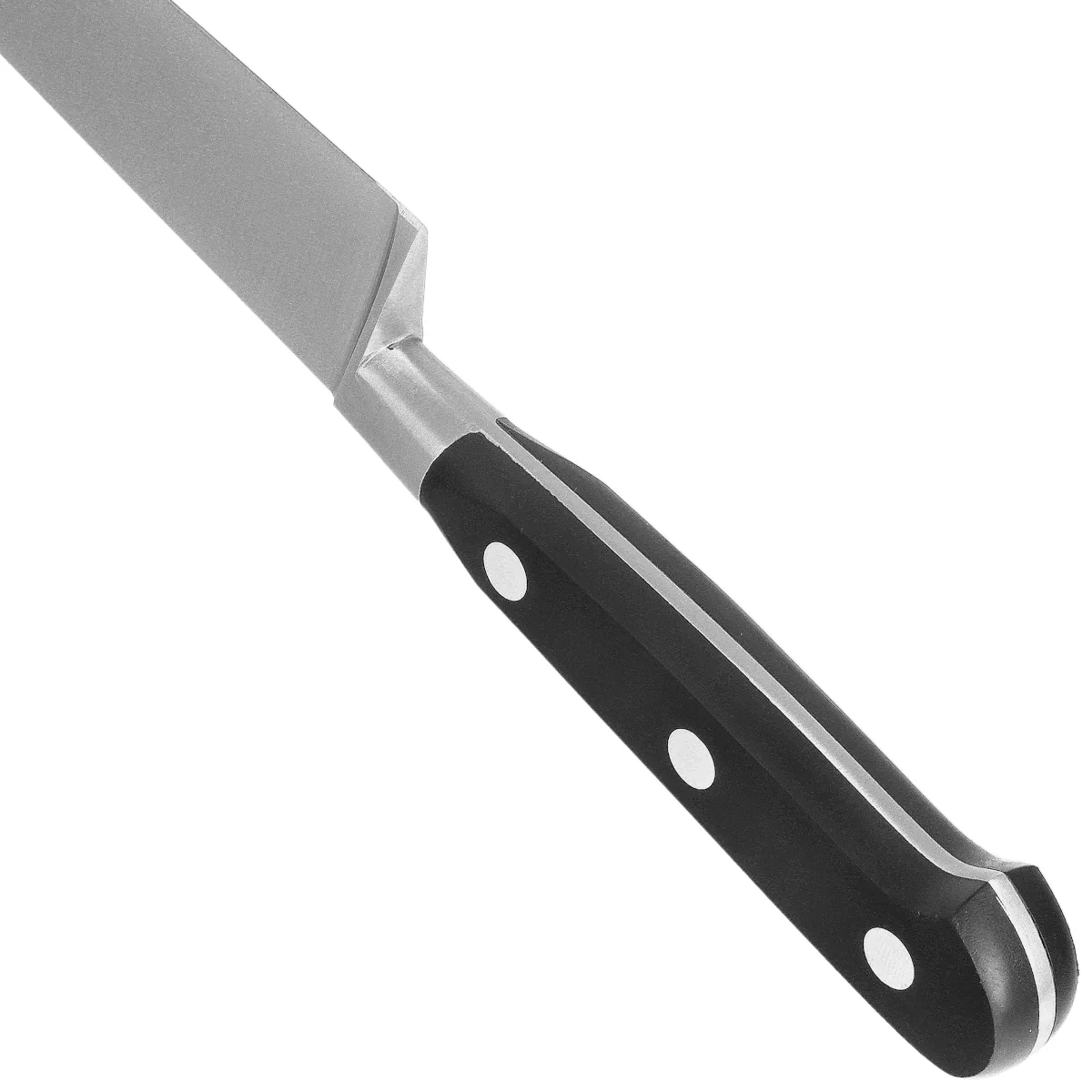 Handle - made of durable POM, a material widely used in professional kitchen equipment due to its dimensional stability, hygiene and wear resistance. Its properties make the tool ideal for intensive work, both in the home kitchen and in catering. The shape of the handle has been designed for a natural hand position, ensuring precise blade control without straining the wrist. The smooth, uniform surface does not absorb odors, does not retain dirt, and allows for quick cleaning, which translates into a high level of hygiene. The connection with the blade has been reinforced with steel rivets, which increases the durability of the construction and eliminates the risk of loosening. It is a solid, ergonomic vegetable knife that ensures reliable performance in all kitchen conditions.