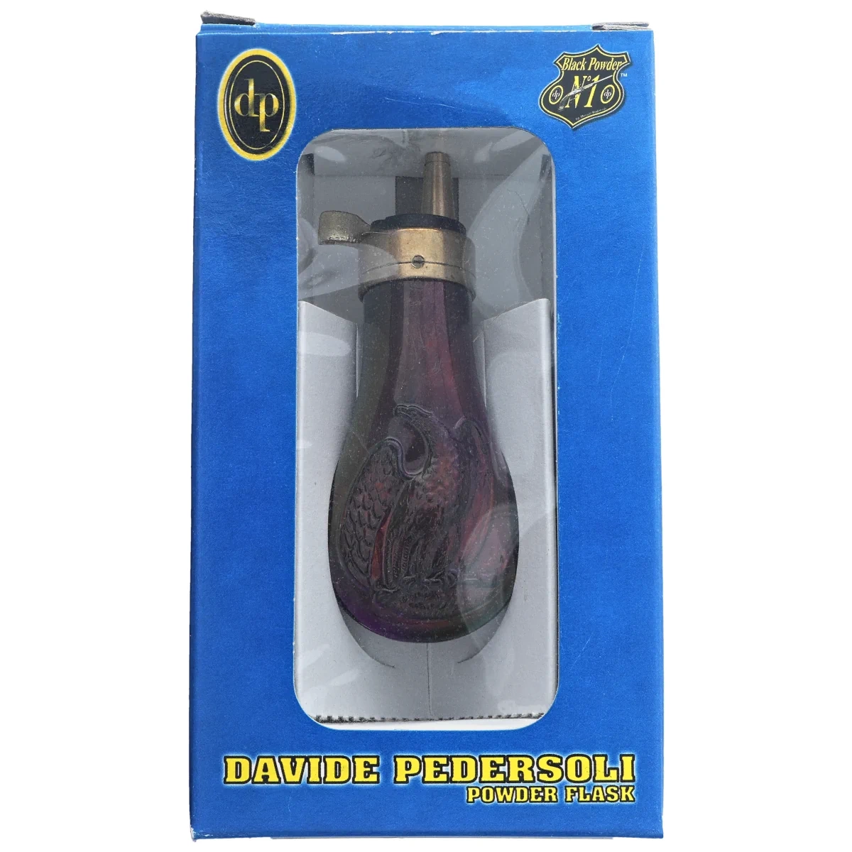 • DP535-31 powder flask with dispenser by Davide Pedersoli. Designed for black powder firearms in .31 cal. Powder charge 9 grains. Made of lacquered copper with a brass dispenser. Adorned with relief of an eagle clutching black powder revolver in its talons