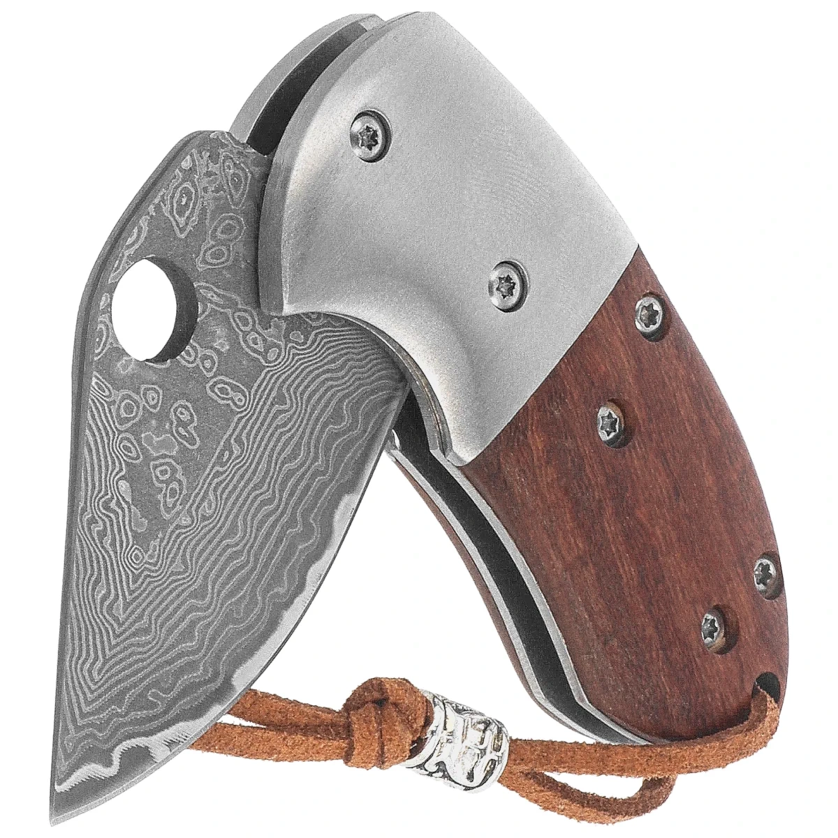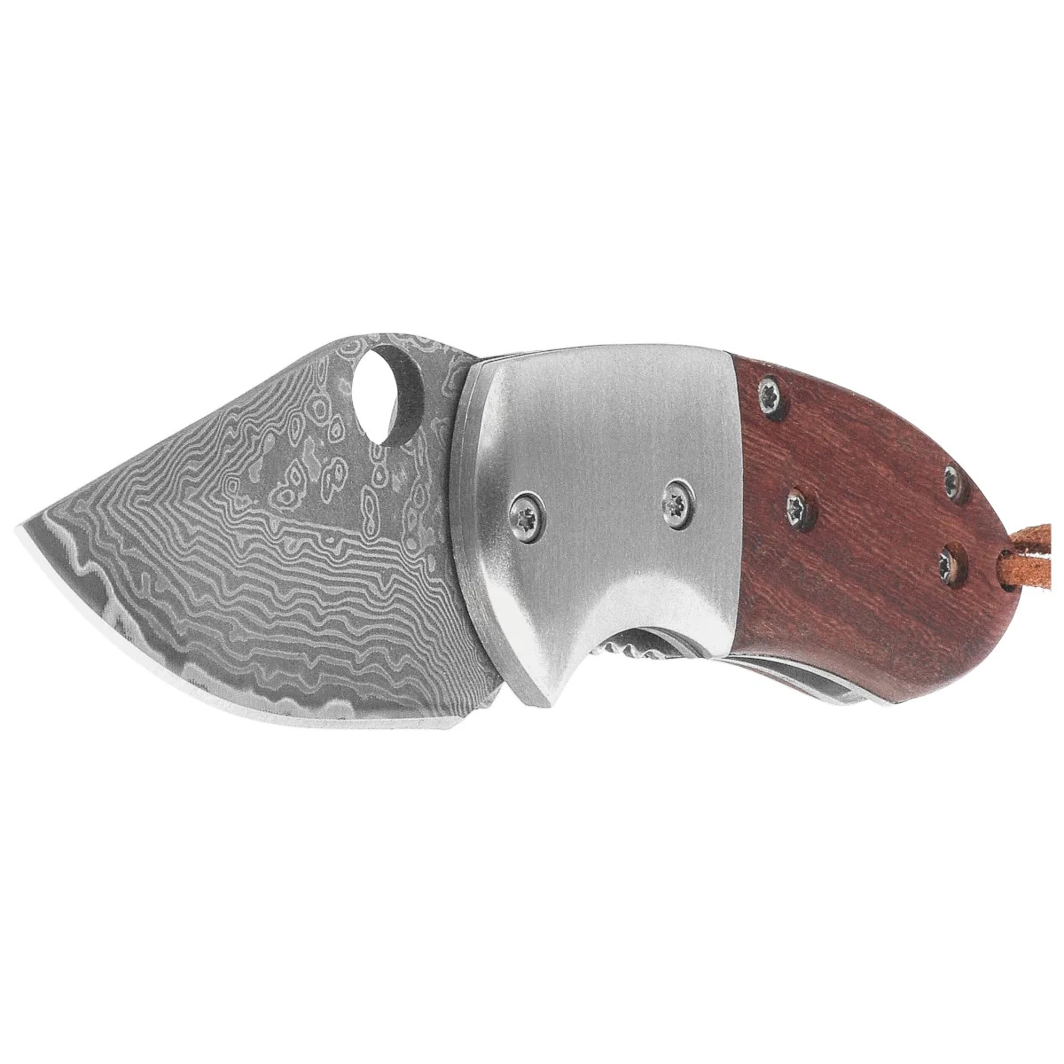 Handle - made of natural wood, whose subtle texture and color introduce an element of craftsmanship. Smooth, rounded edges provide a comfortable grip, and the precise fit with the steel body ensures stability of the design. The lack of a clip promotes a minimalist aesthetic, and a leather thong with a metal ring allows for quick attachment to a backpack or EDC kit. Compact dimensions and careful processing make the Handle perfectly complements the Blade made of damast - creating a folding knife, which combines functionality, durability and classic elegance.