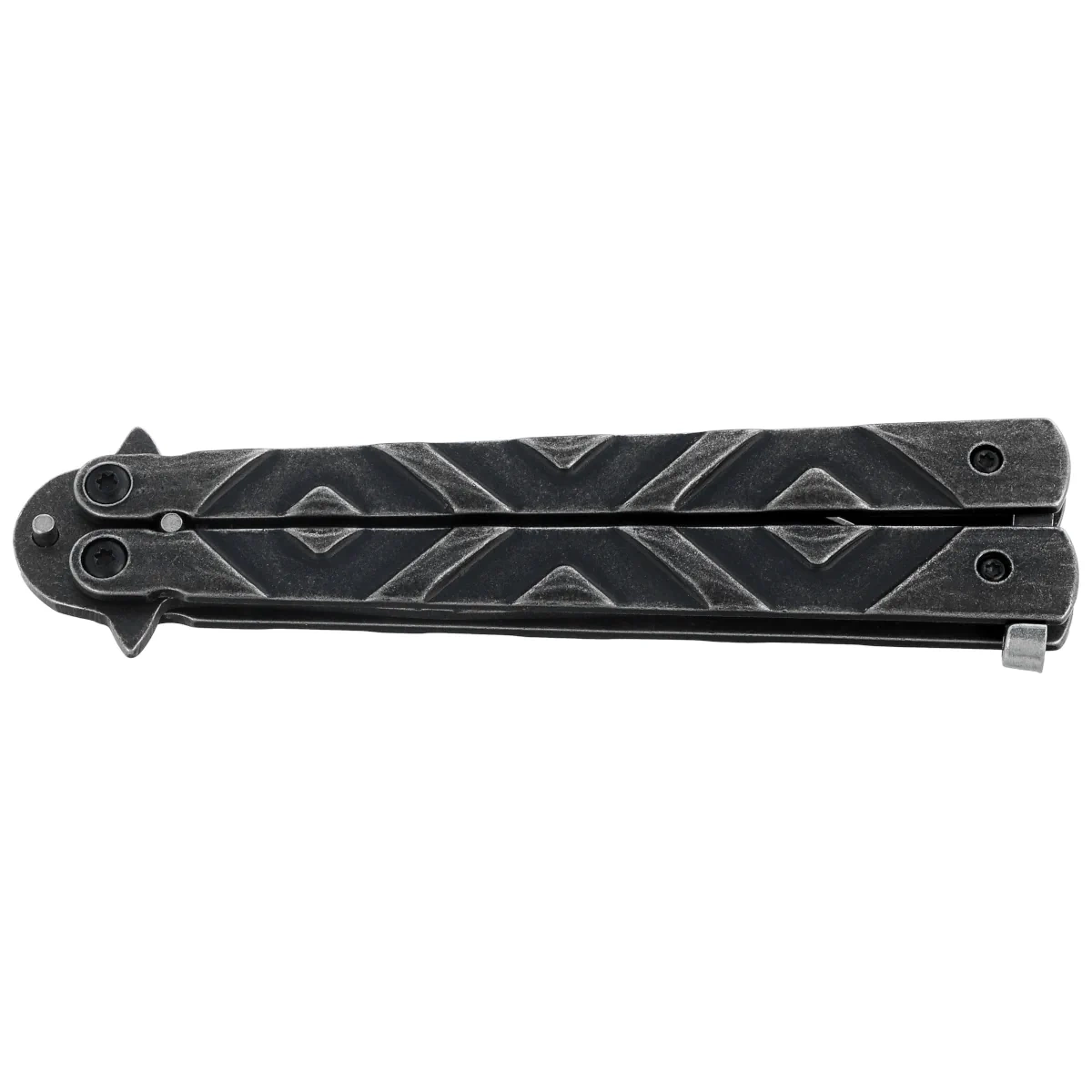 Handle - made of stainless steel with a stonewashed finish, which ensures durability, a consistent look with the blade and resistance to signs of wear. The symmetrical arm layout supports the balance of the knife, which is crucial when performing spins and tricks. The lack of texture is compensated by the balance and length of the handle, which translates into a stable grip. The handle has no clip or lanyard hole - this is a deliberate simplification, in line with the demonstration and training character of the design. The whole is closed with a classic latch, which locks the blade in both positions and allows for quick securing of the knife. The 02105 model is a solid, minimalist choice for those looking for a stylish and durable butterfly knife for everyday practice or collecting.