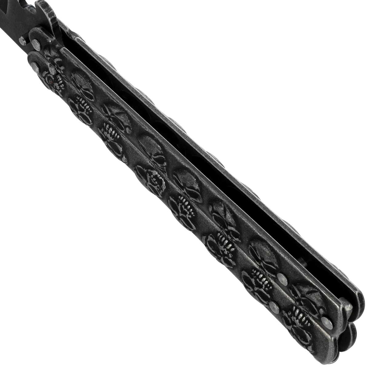 Handle - was made of stainless steel also finished with Stonewashed method, which provides durability and appropriate structural weight. Its symmetrical form promotes even balance, making it easier to perform tricks and spins. The whole design is covered with a skull motif, which distinguishes the knife visually and improves grip security. The design does not include a clip or cord hole, which confirms its show and training nature. This Handle is designed for users looking for a visually strong balisong with good control and distinctive styling.