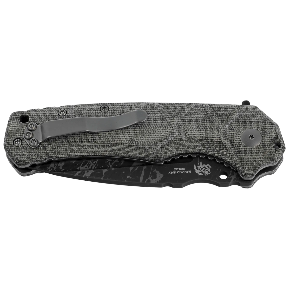 Blade - with a drop point profile provides high utility versatility - from precision cutting to jobs that require a lot of control over the depth of cut. The Niolox steel used combines high abrasion resistance, long-term cutting edge stability and corrosion resistance, while maintaining relative ease of sharpening in field conditions. A hardness of 59-61 HRC ensures long blade life in everyday use. Blade surface was finished using the acid washed method , giving it a rough, utilitarian look and increased resistance to micro-scratches and light reflections. The knife is opened with a smooth-running flipper on bearings, which allows the blade to be unfolded instantly and safely with one hand. On the back there is a notched thumb rest (jimping), improving grip stability during precision work. The whole is locked with a solid liner lock mechanism , ensuring secure immobilization of the blade in the working position.